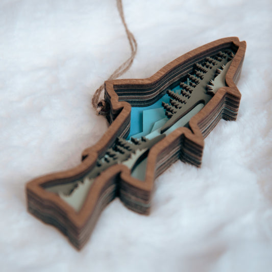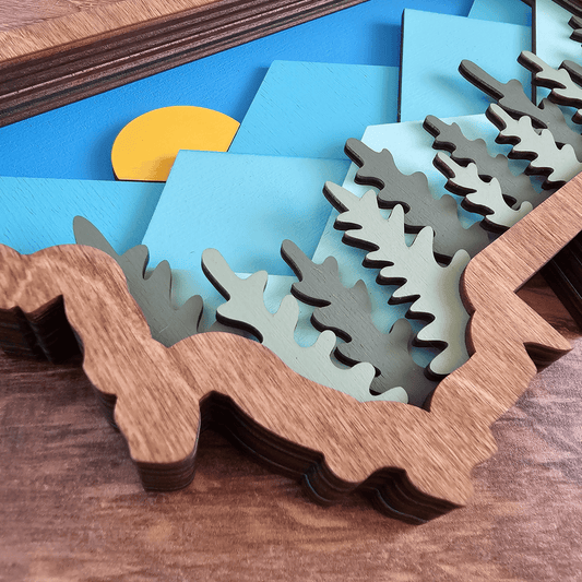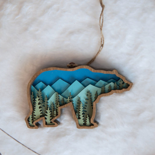 3D Layered Wood Grizzly Bear Art With Mountain and Forest Landscape