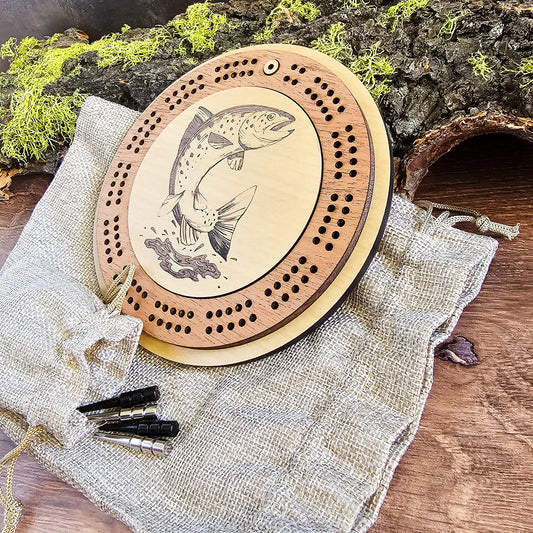 Trout Fish Engraved Mini Circle Travel Cribbage Board