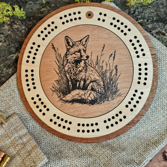 Fox Engraved Mini Circle Travel Cribbage Board