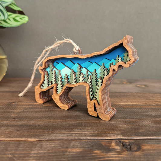 3D Layered Wood Grizzly Bear Art With Mountain and Forest Landscape