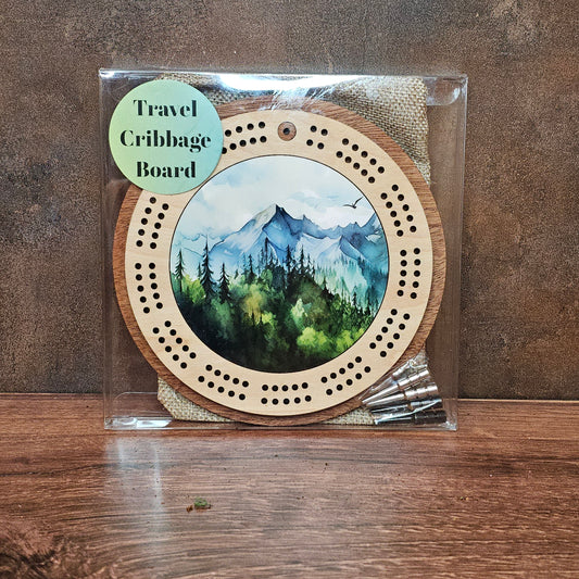 Watercolor Mountain Scene Mini Circle Cribbage Board