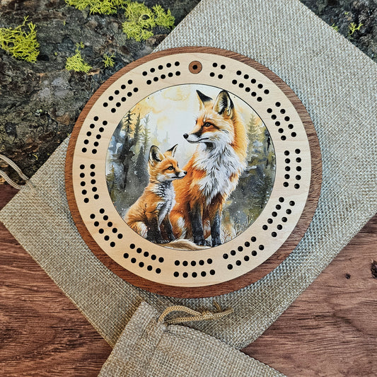 Colorful Fox and Kit Scene Mini Circle Cribbage Board