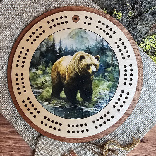 Grizzly Bear Design Mini Circle Cribbage Board