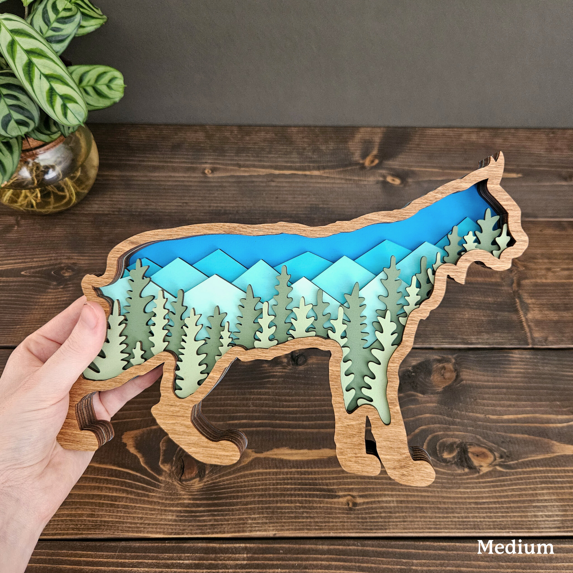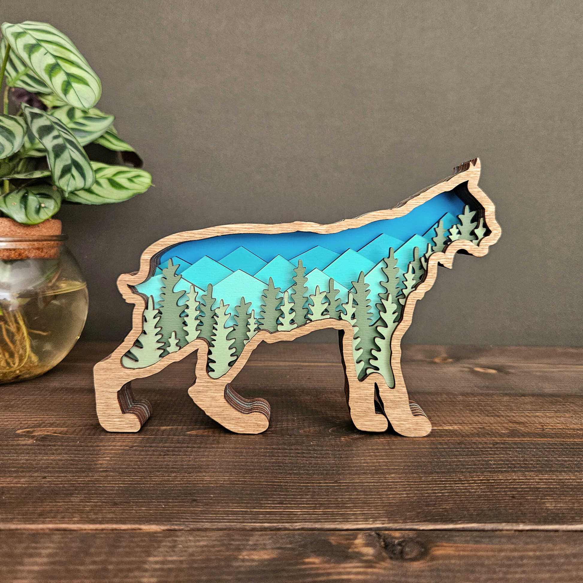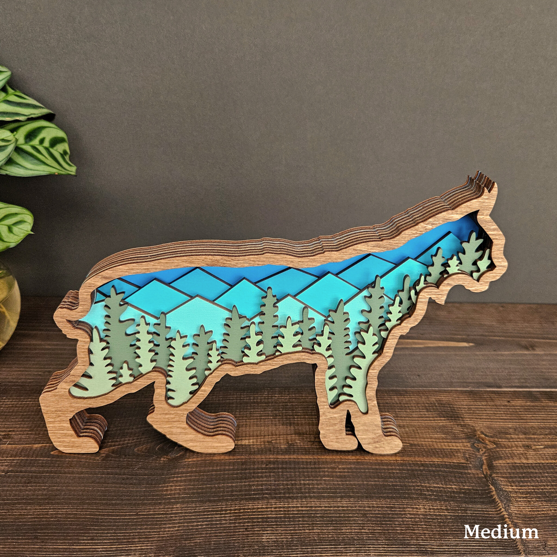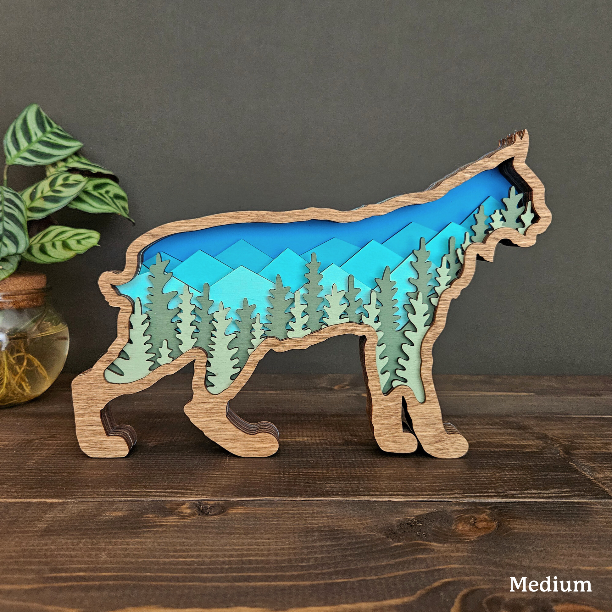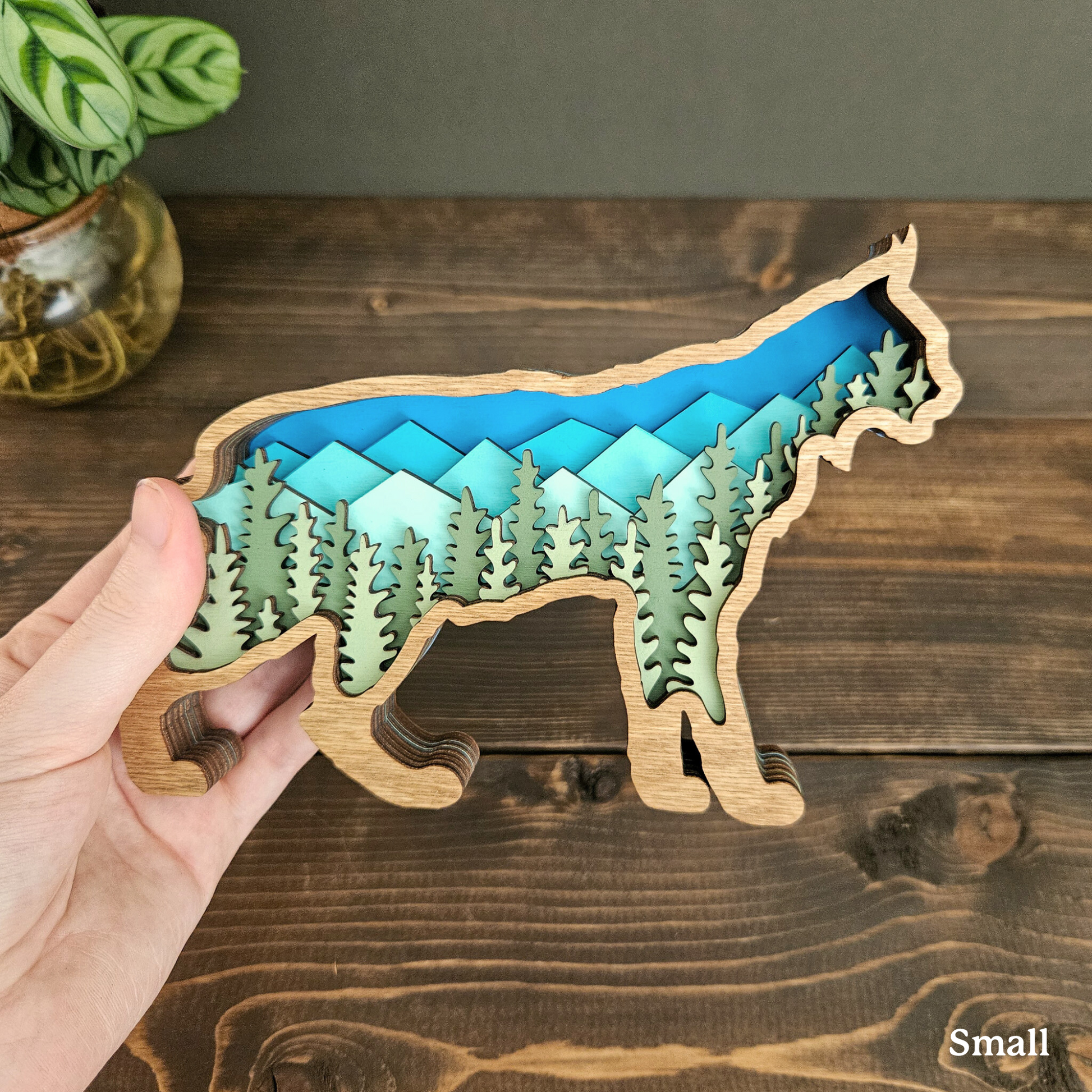 The details in this wood-layered Bobcat art piece are amazing. It will look great in your home, office or cabin.