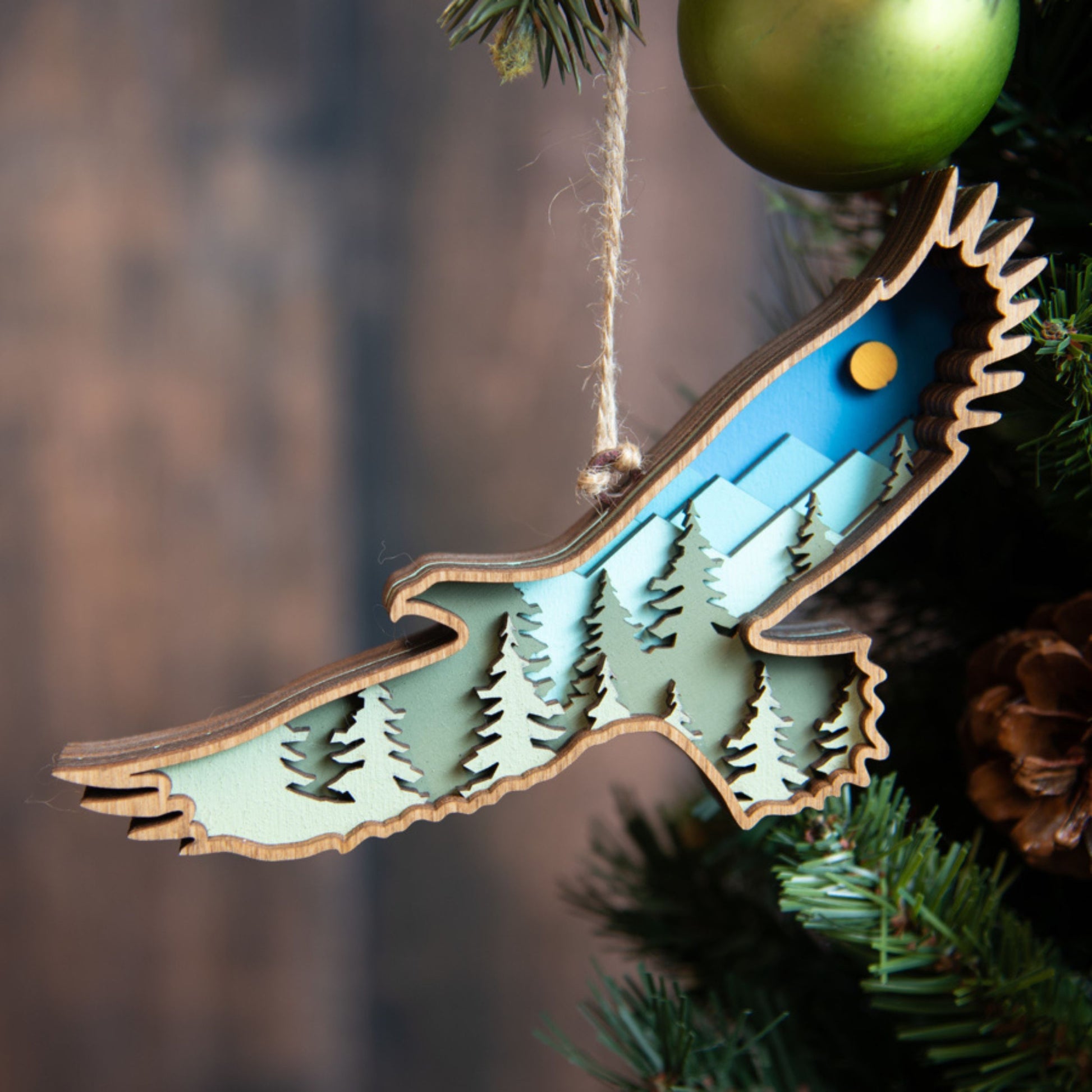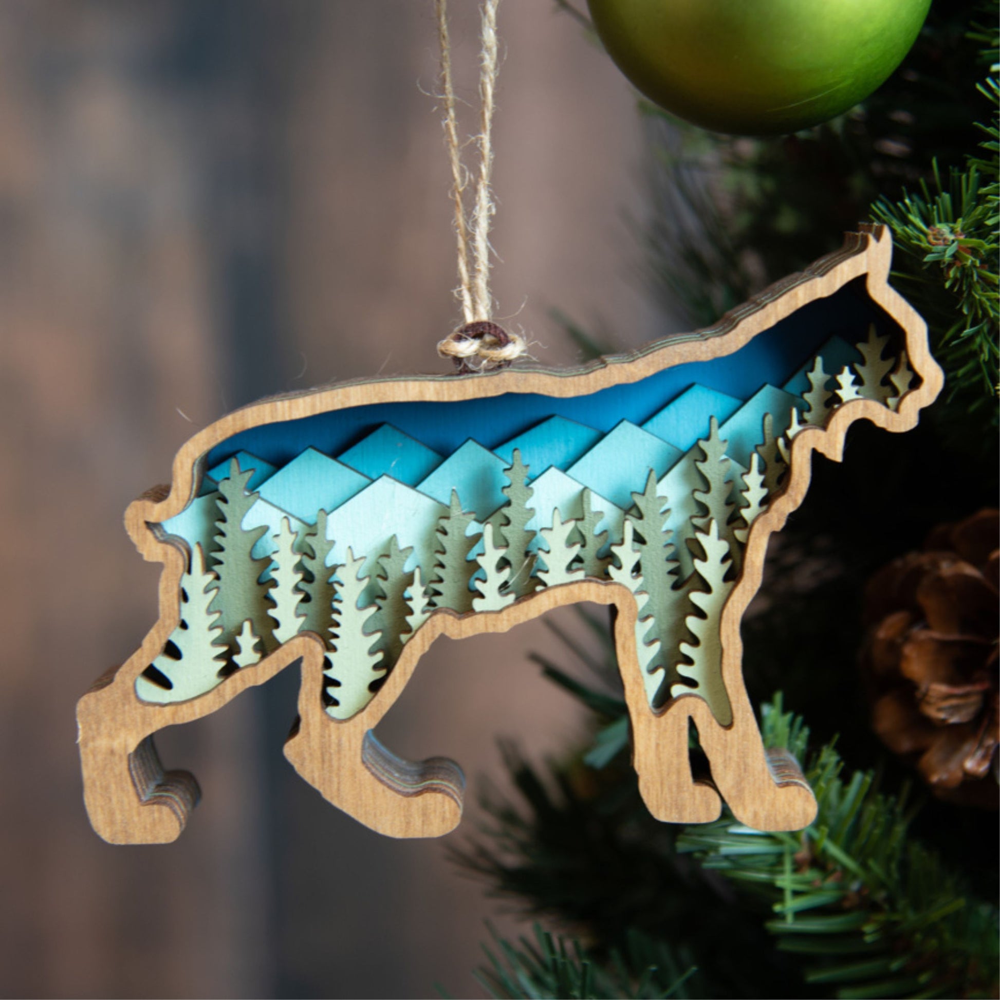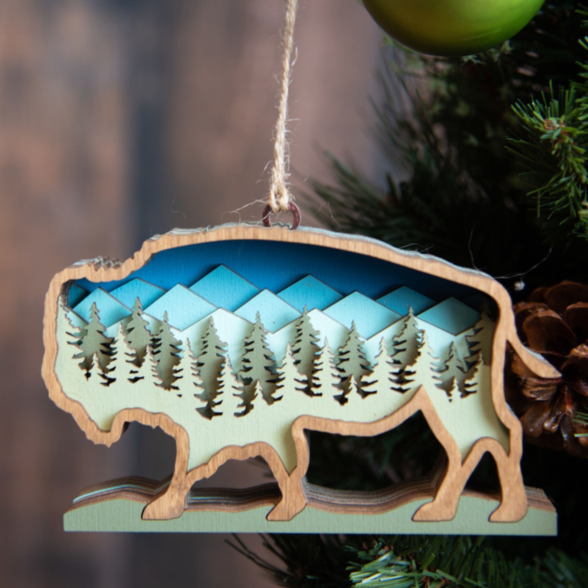 This beautiful wood fish ornament is sure to be treasured for years to come. Crafted with 7 distinct layers painted or stained a different hue to match the beauty of nature. The 3D ornament is inset with detailed mountain and tree layers, perfect for any nature-lover or outdoor enthusiast. The size allows it to stand out on a large tree or add charm to a smaller tabletop one. The hanger is a natural twine to emphasize the woodland feel.