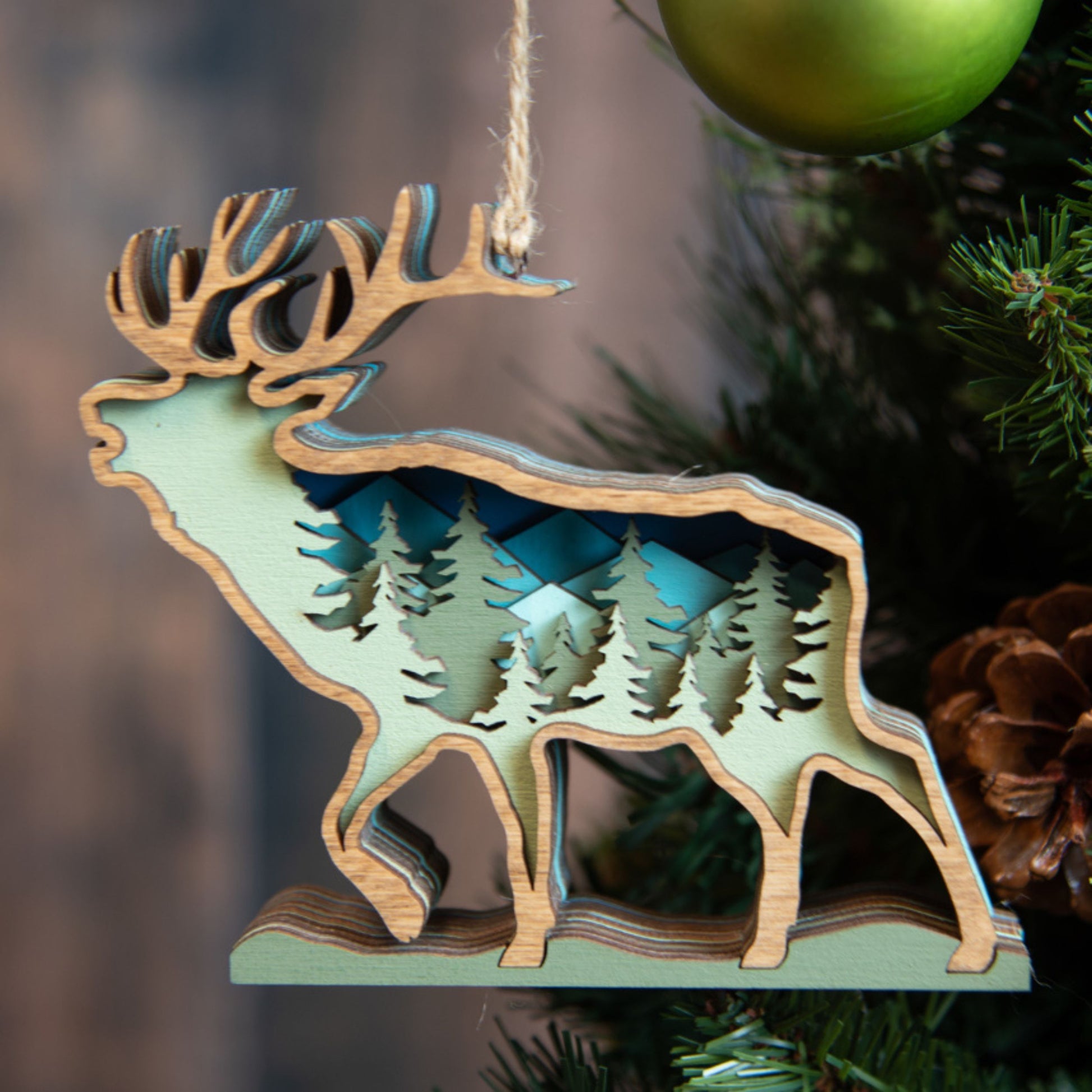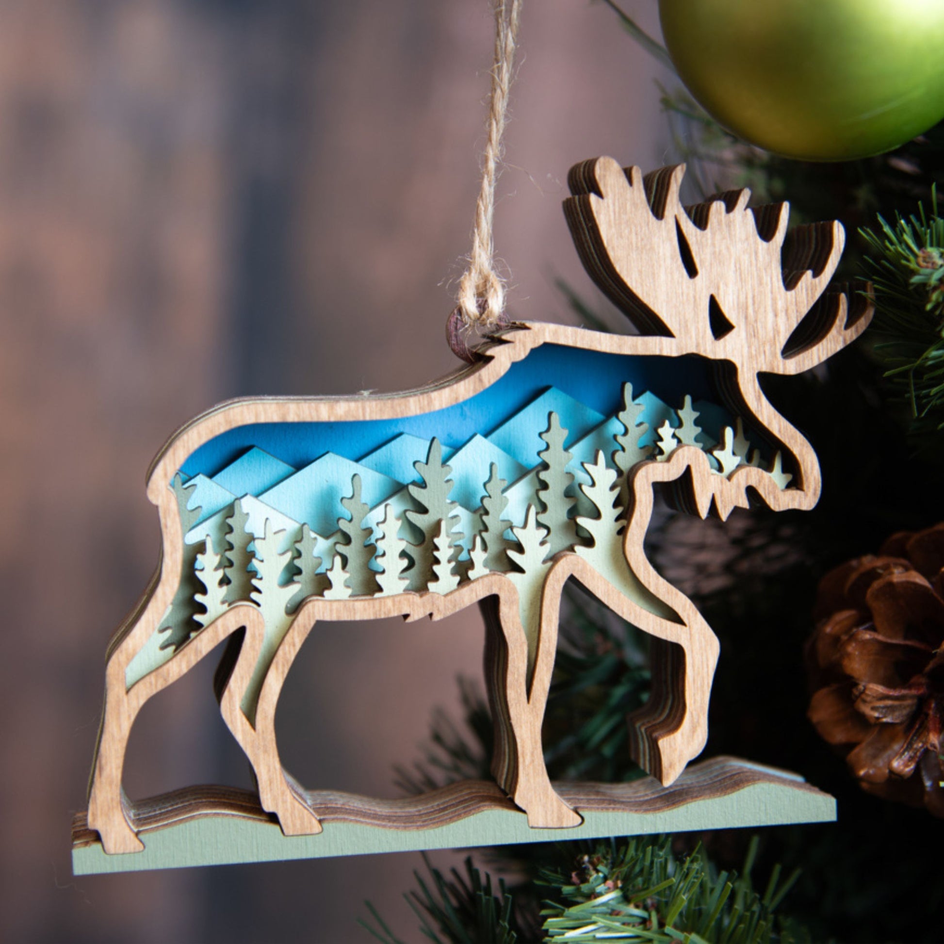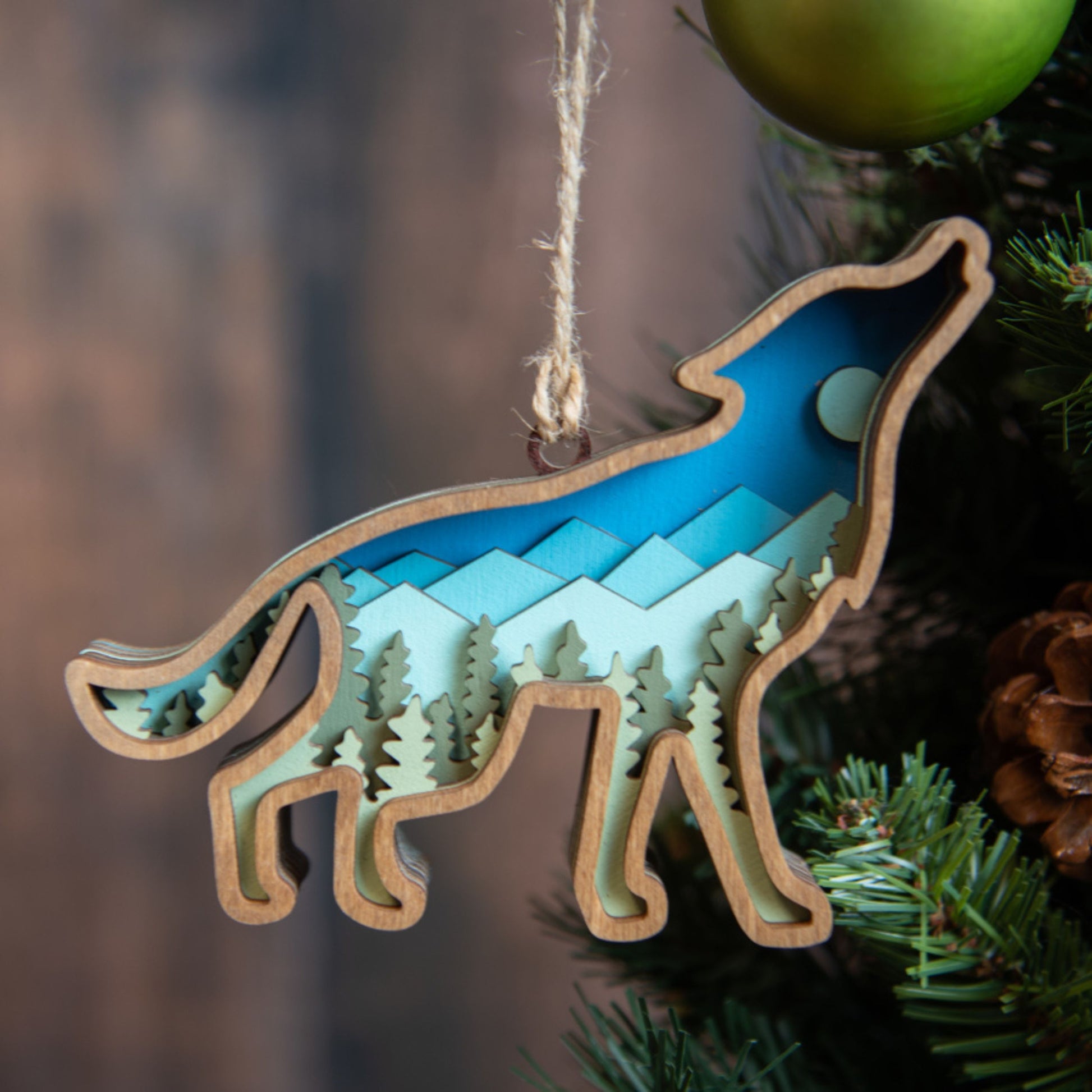 This beautiful wood fish ornament is sure to be treasured for years to come. Crafted with 7 distinct layers painted or stained a different hue to match the beauty of nature. The 3D ornament is inset with detailed mountain and tree layers, perfect for any nature-lover or outdoor enthusiast. The size allows it to stand out on a large tree or add charm to a smaller tabletop one. The hanger is a natural twine to emphasize the woodland feel.