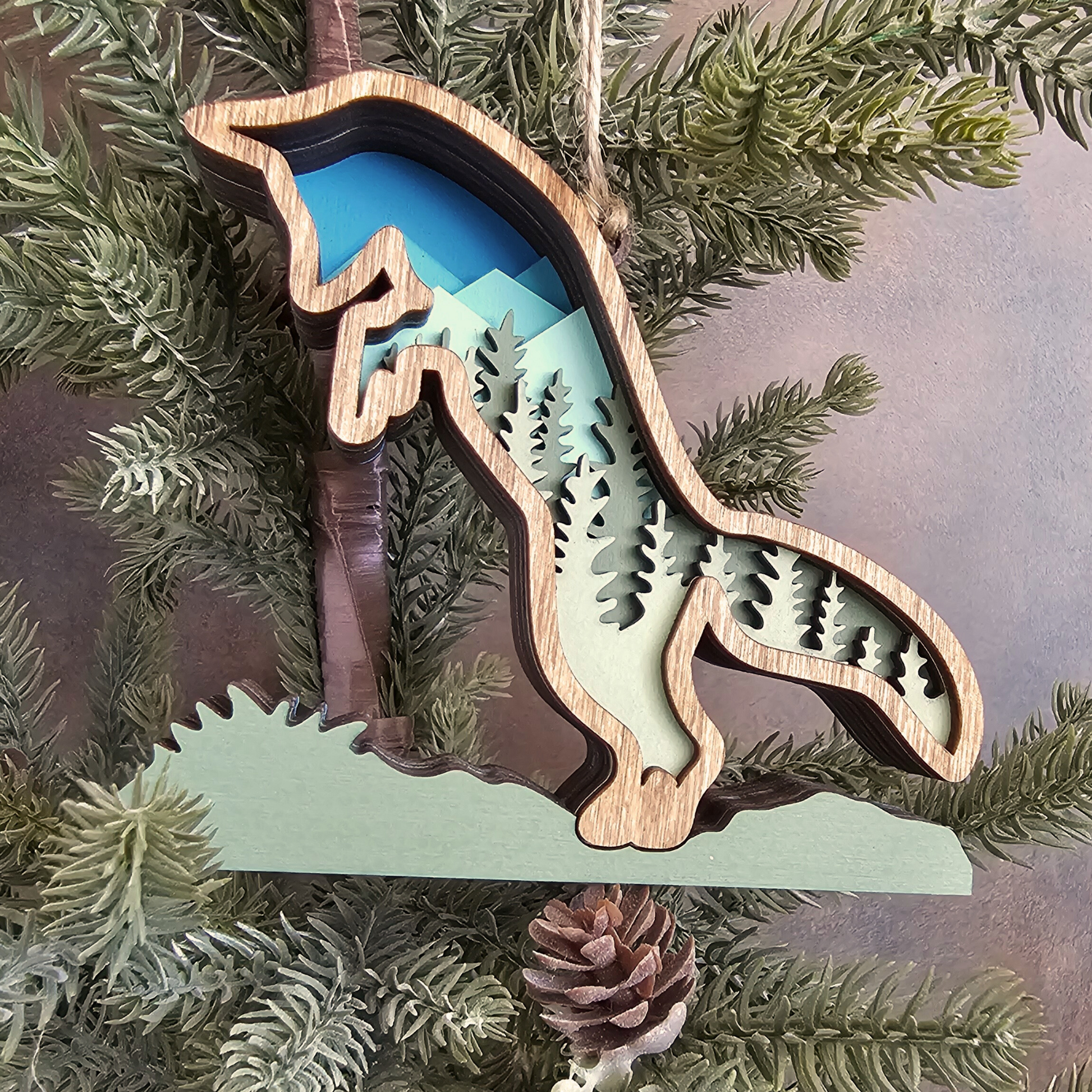 This beautiful fox ornament will be a keepsake for years to come. The 3d wood fox has 7 distinct layers each hand painted or stained a different color. The back is also stained to have a finished look. With the mountains and trees set into the fox outline this is a perfect gift for the nature lover. The size allows it to stand out on your large tree yet not overwhelm a smaller tabletop tree. The hanger is a simple twine to accent the natural look and not to take away from the beauty of the fox design.