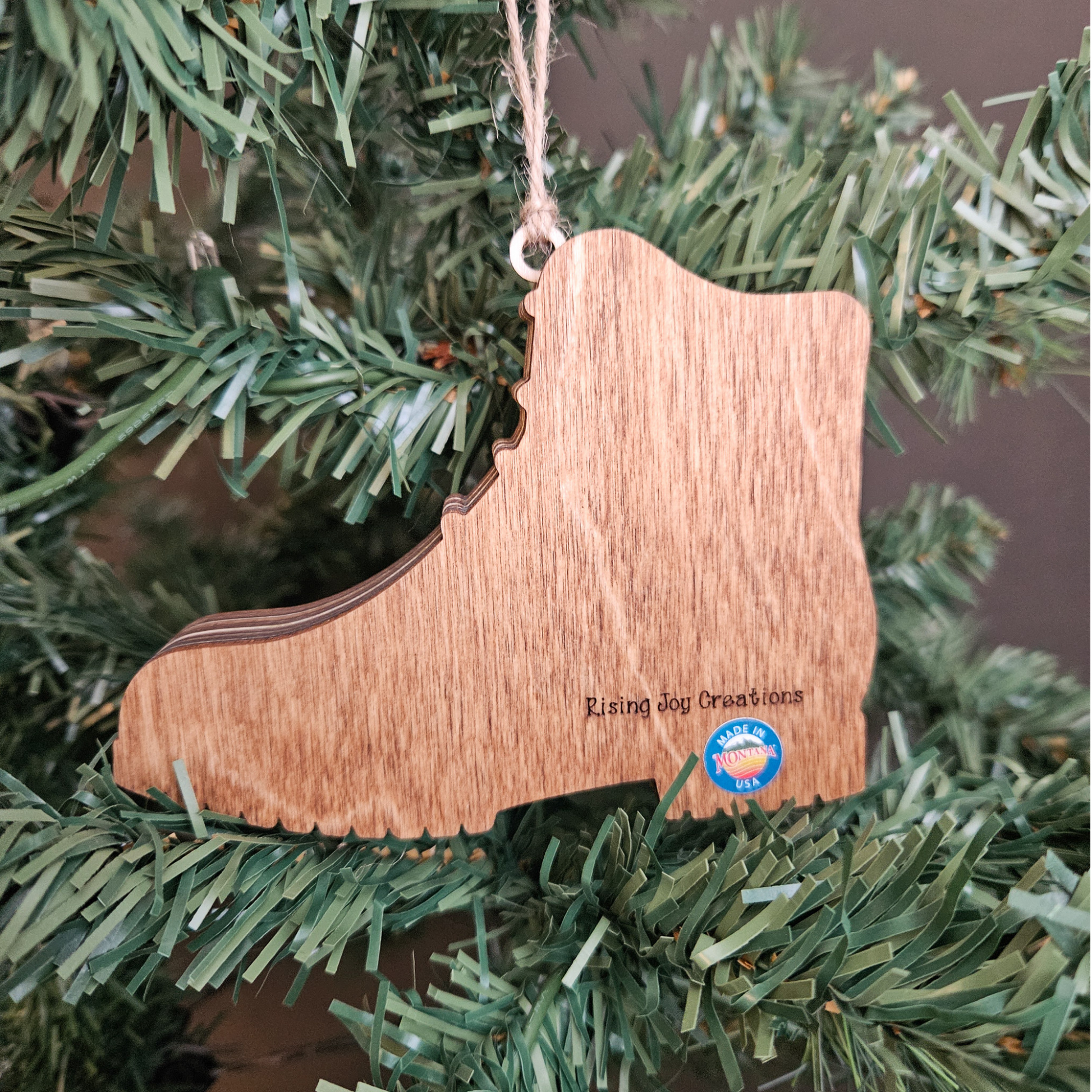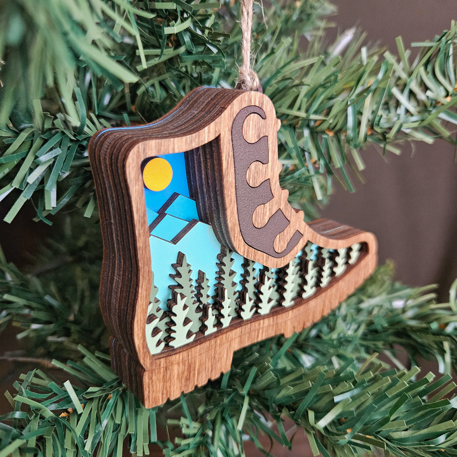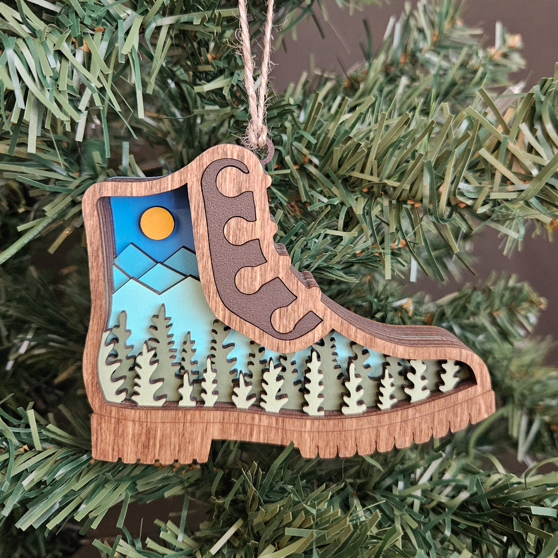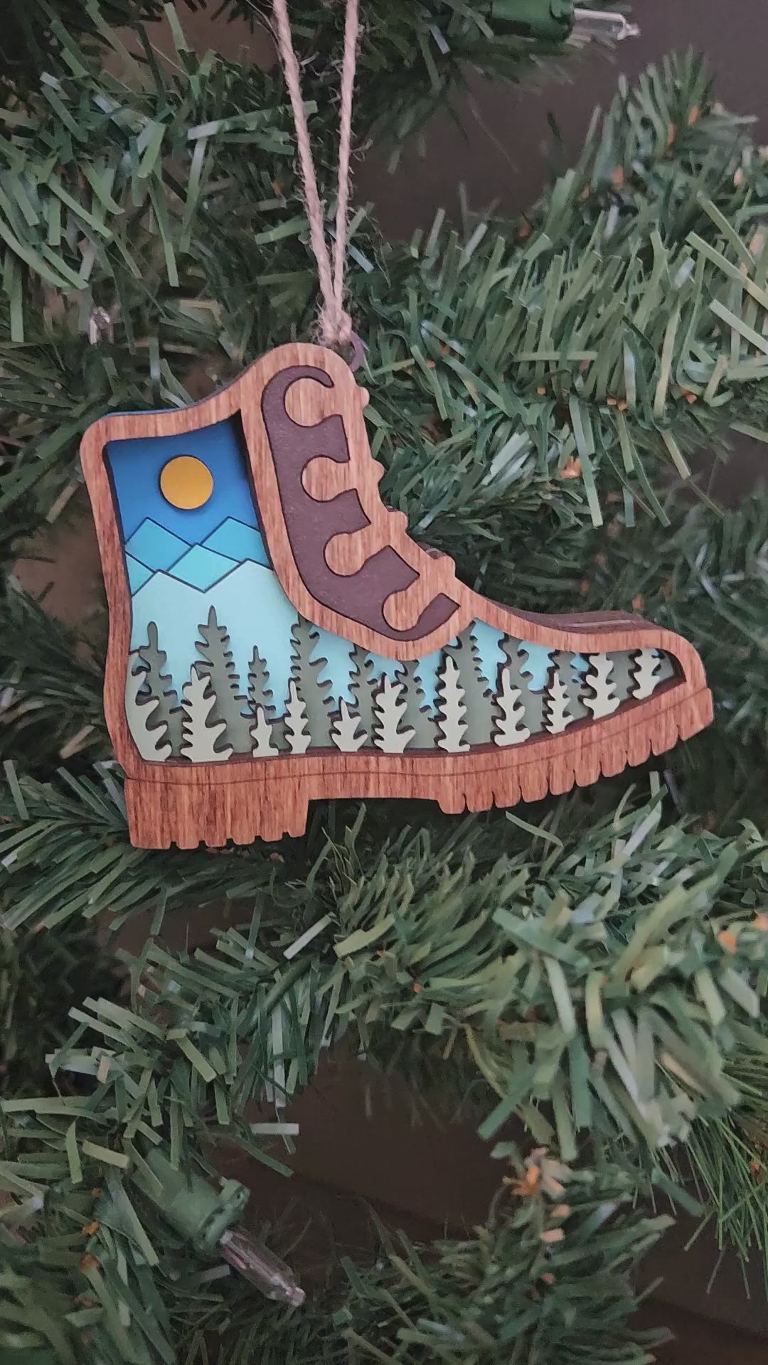 This beautiful hiking boot ornament will be a keepsake for years to come. The 3d wood hiking boot has 7 distinct layers each hand painted or stained a different color. The back is also stained to have a finished look. With the mountains and trees set into the hiking boot outline this is a perfect gift for the nature lover. The size allows it to stand out on your large tree yet not overwhelm a smaller tabletop tree. The hanger is a simple twine to accent the natural look and not to take away from the beauty of the hiking boot design.