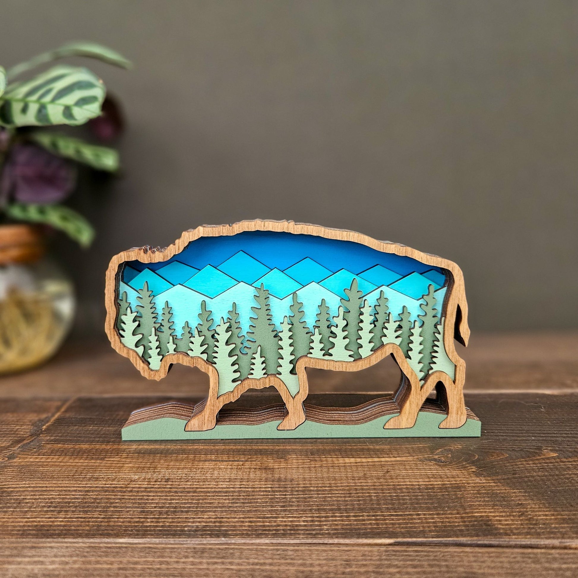 Each piece is made from high-quality wood, showcasing natural variations in grain and texture, ensuring every bison is unique. The carefully layered craftsmanship enhances the design’s depth, creating a lasting work of art that will stand the test of time.