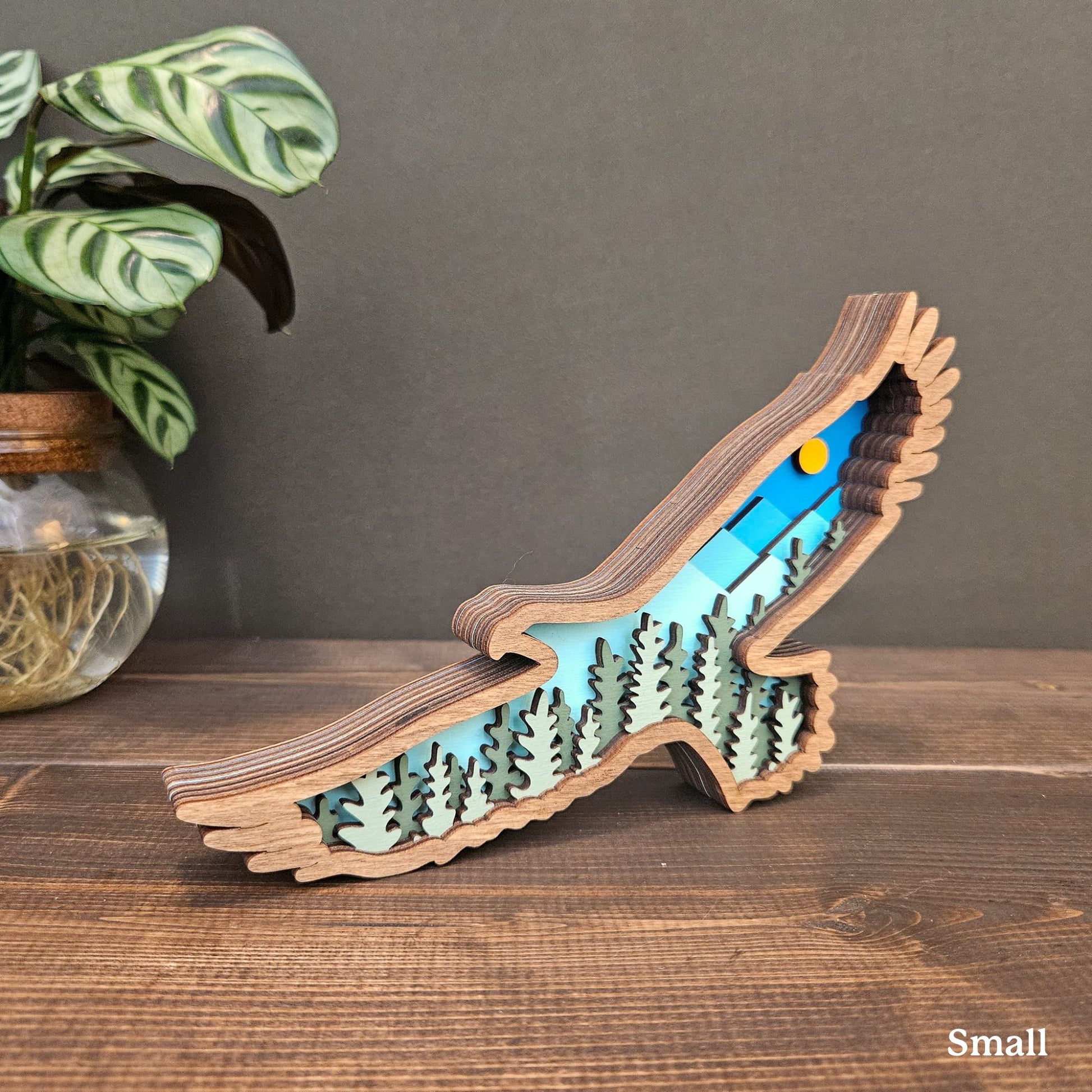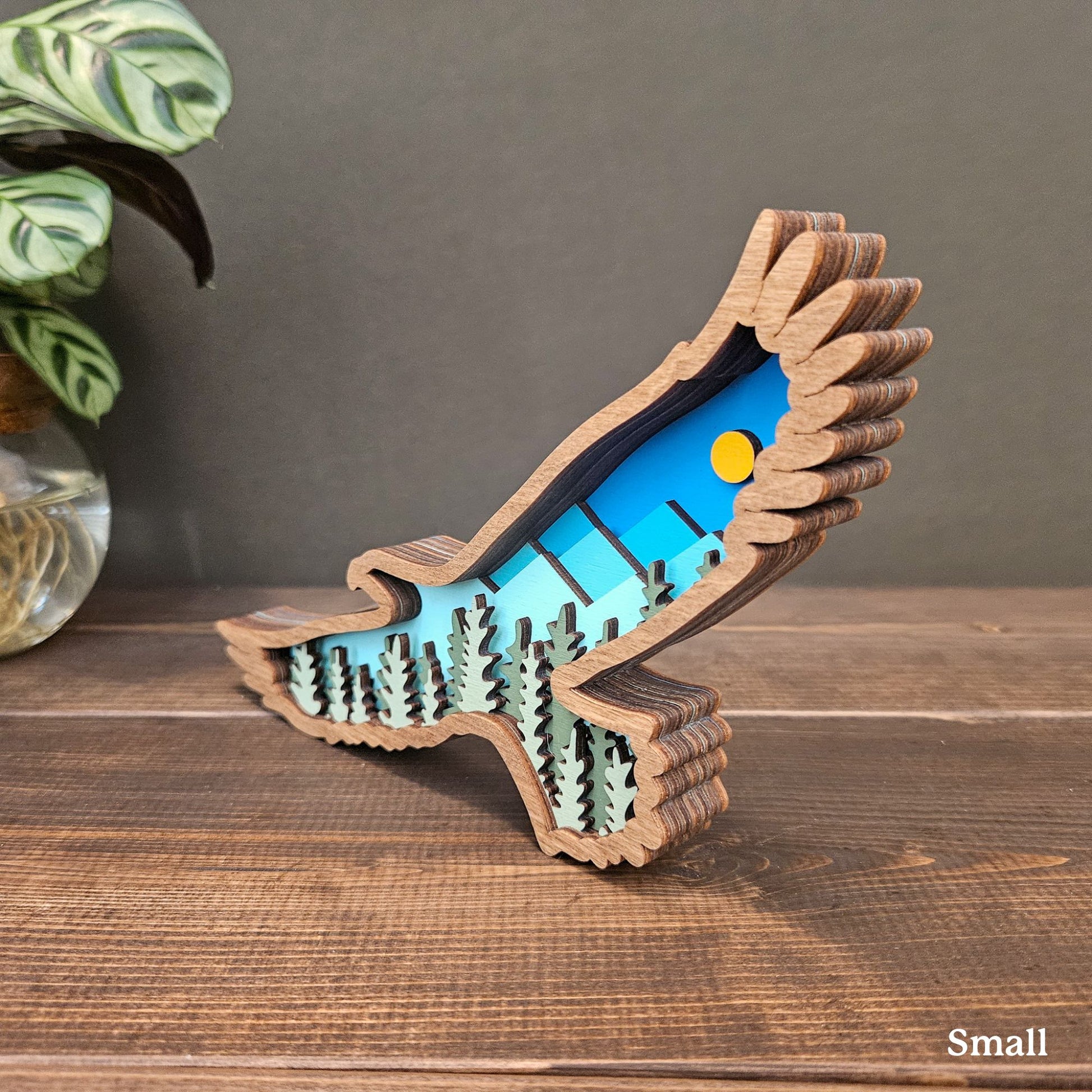 With intricate detailing and depth, this 3D eagle captures the power and grace of this iconic bird with a mountain and forest scene inside. Whether you're an outdoor enthusiast, a patriot, or simply appreciate fine craftsmanship, this piece is sure to make a statement.