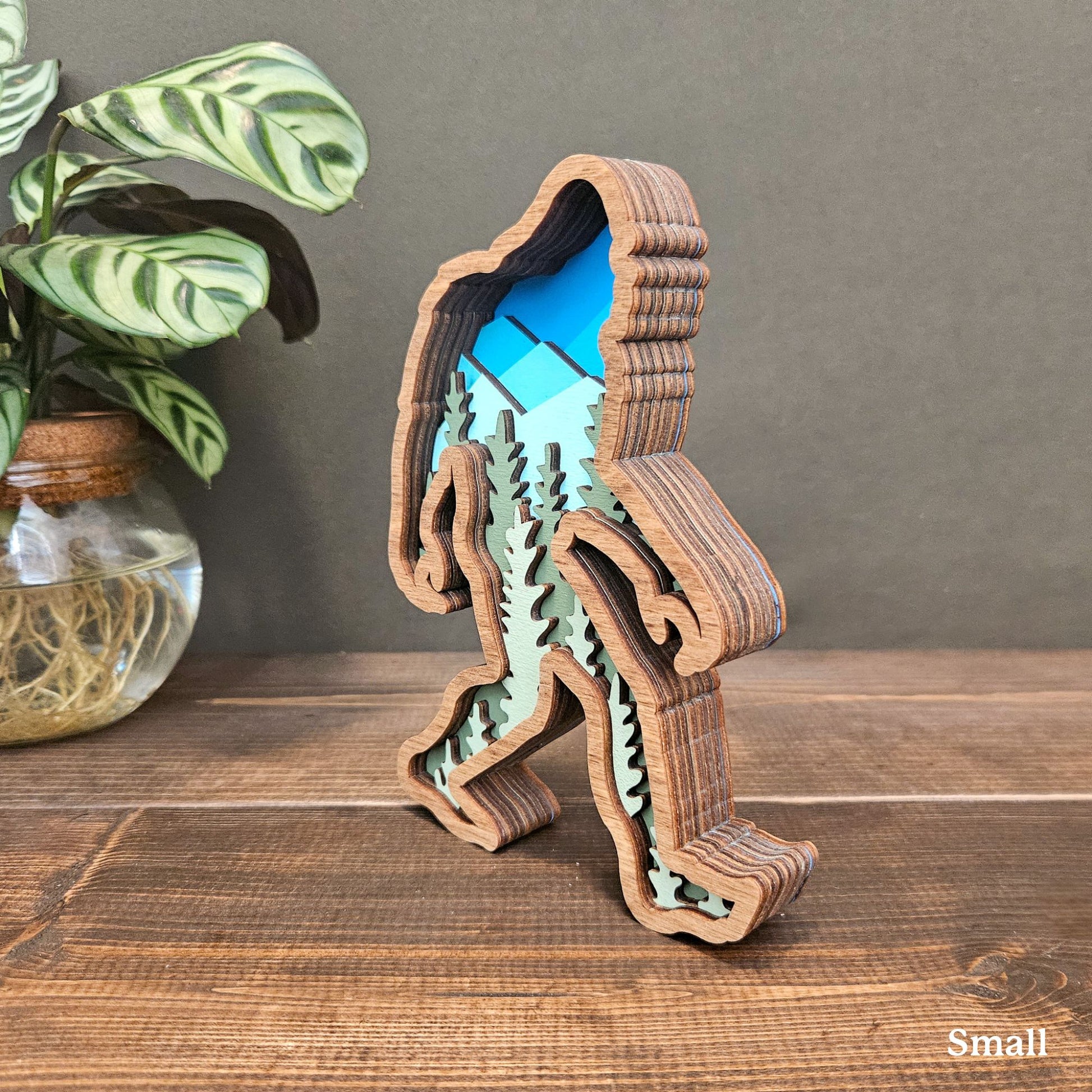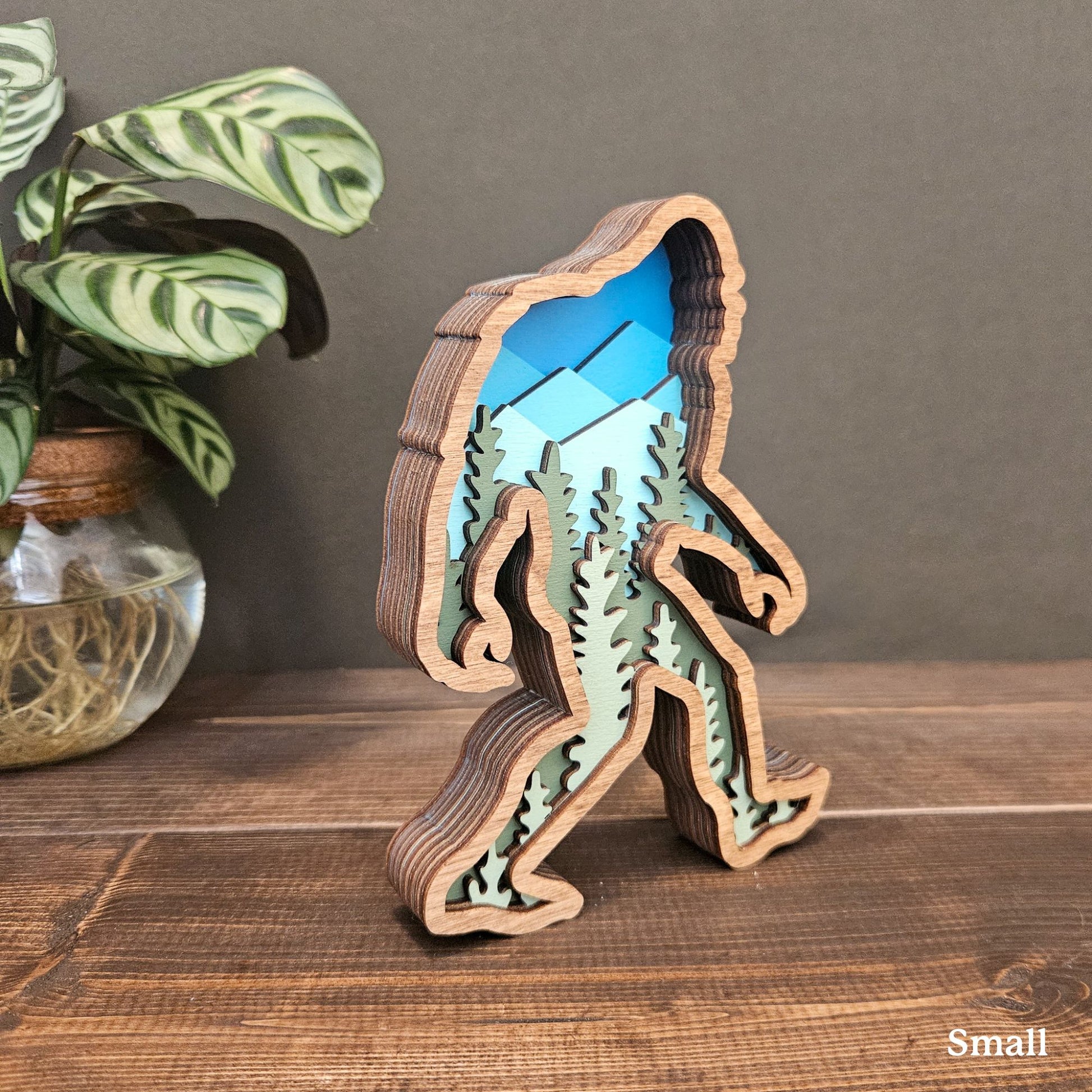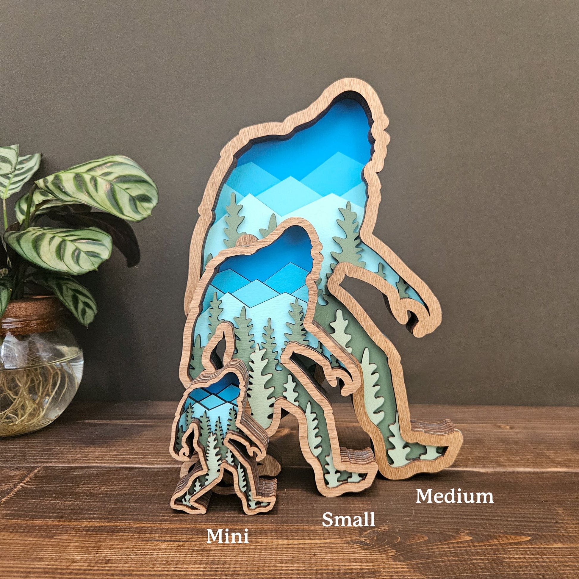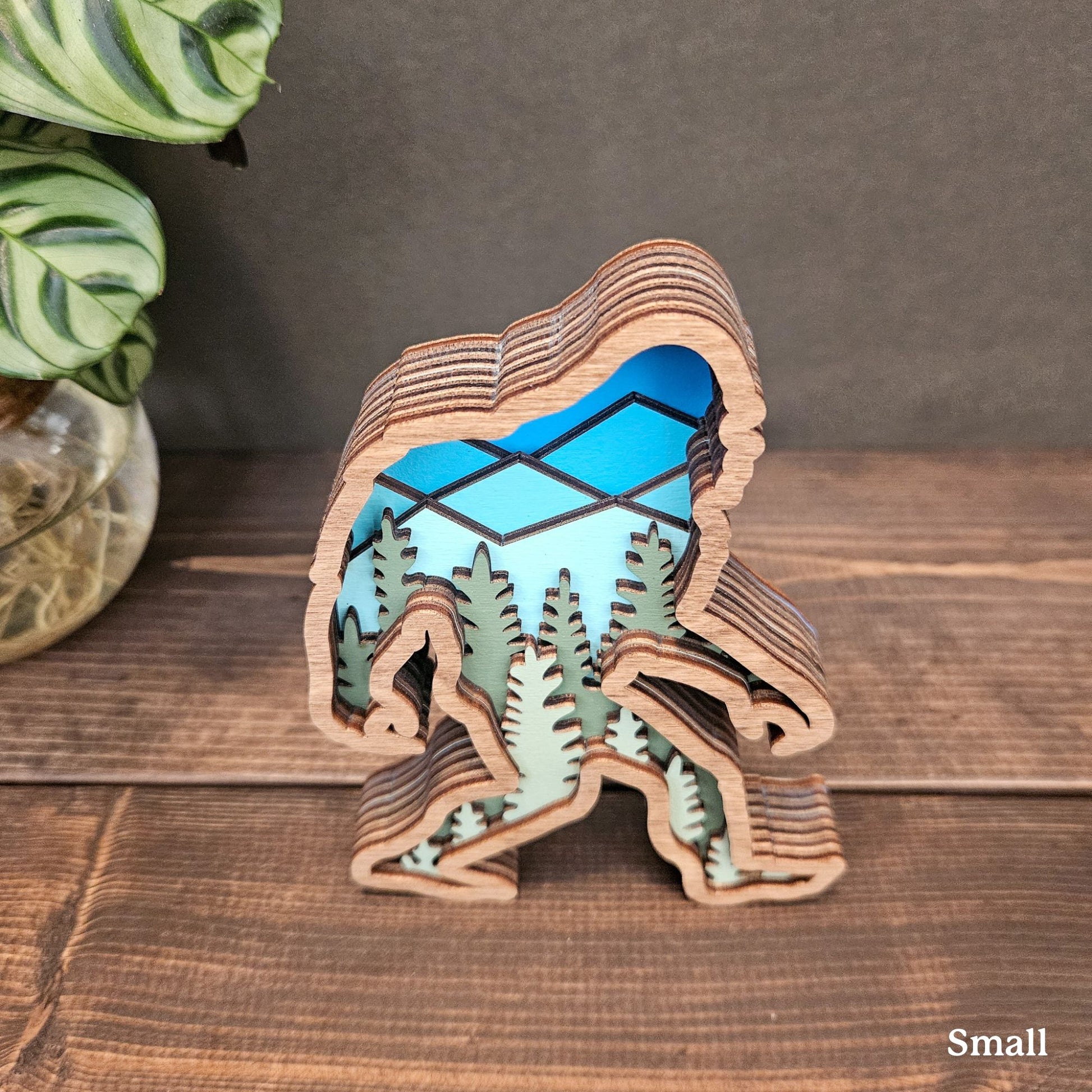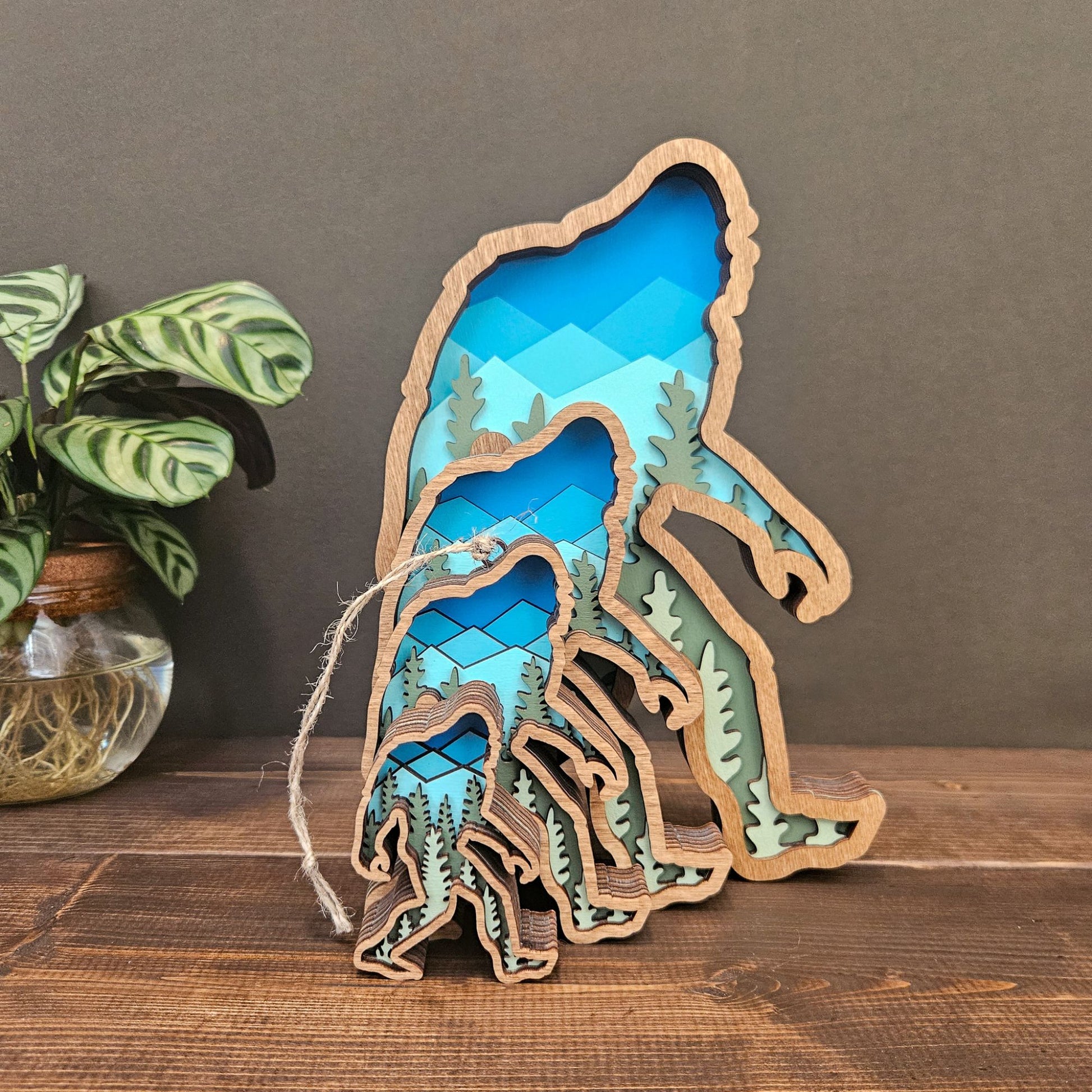 3D Layered Wood Bigfoot Sasquatch Art with Mountain and Forest Landscape