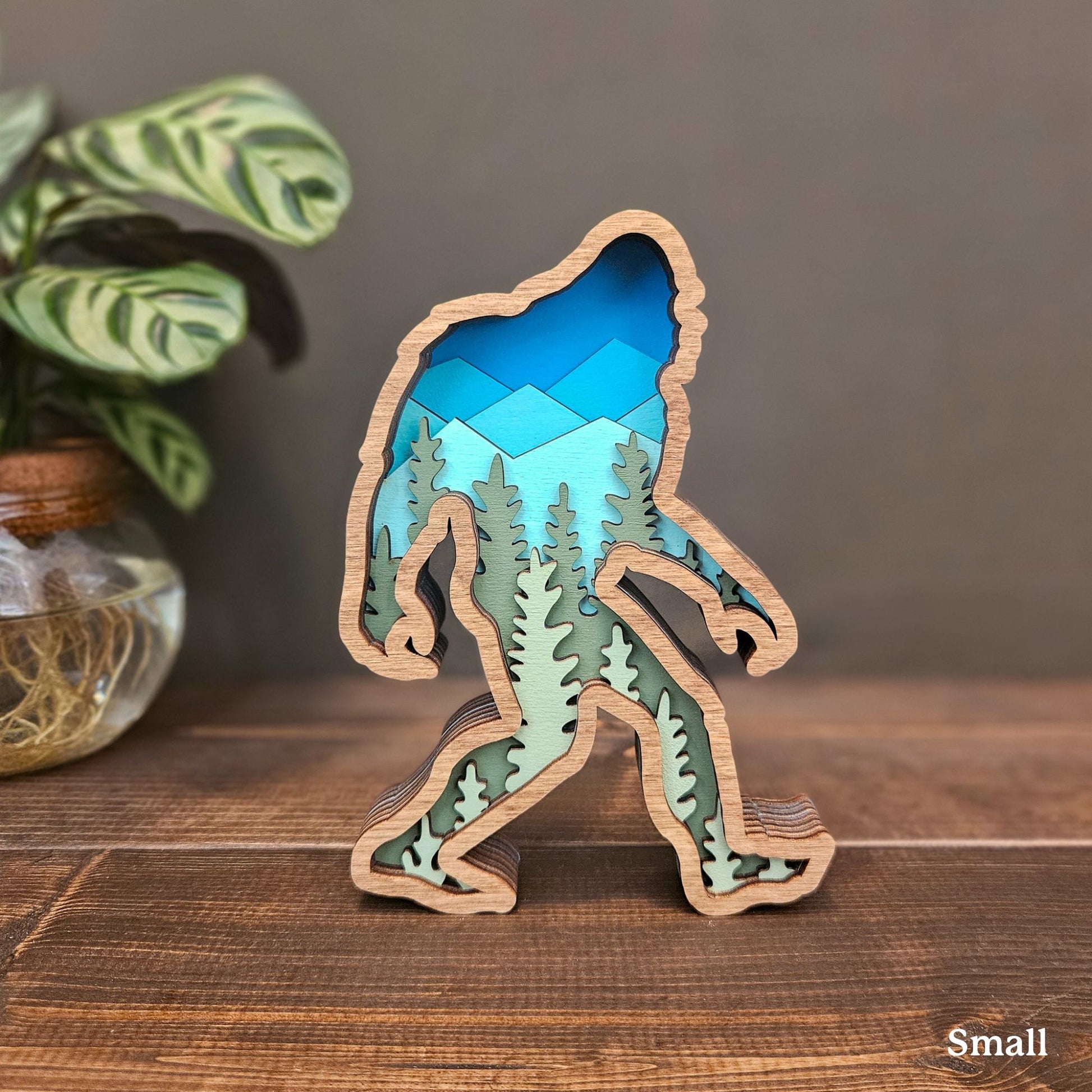 This stunning layered wooden piece features a detailed mountain and forest scene inside Bigfoot’s silhouette, making it the perfect addition to your home, cabin, or office. Whether you're a believer, a nature enthusiast, or just love unique decor, this piece brings the spirit of adventure and the great outdoors into your space.