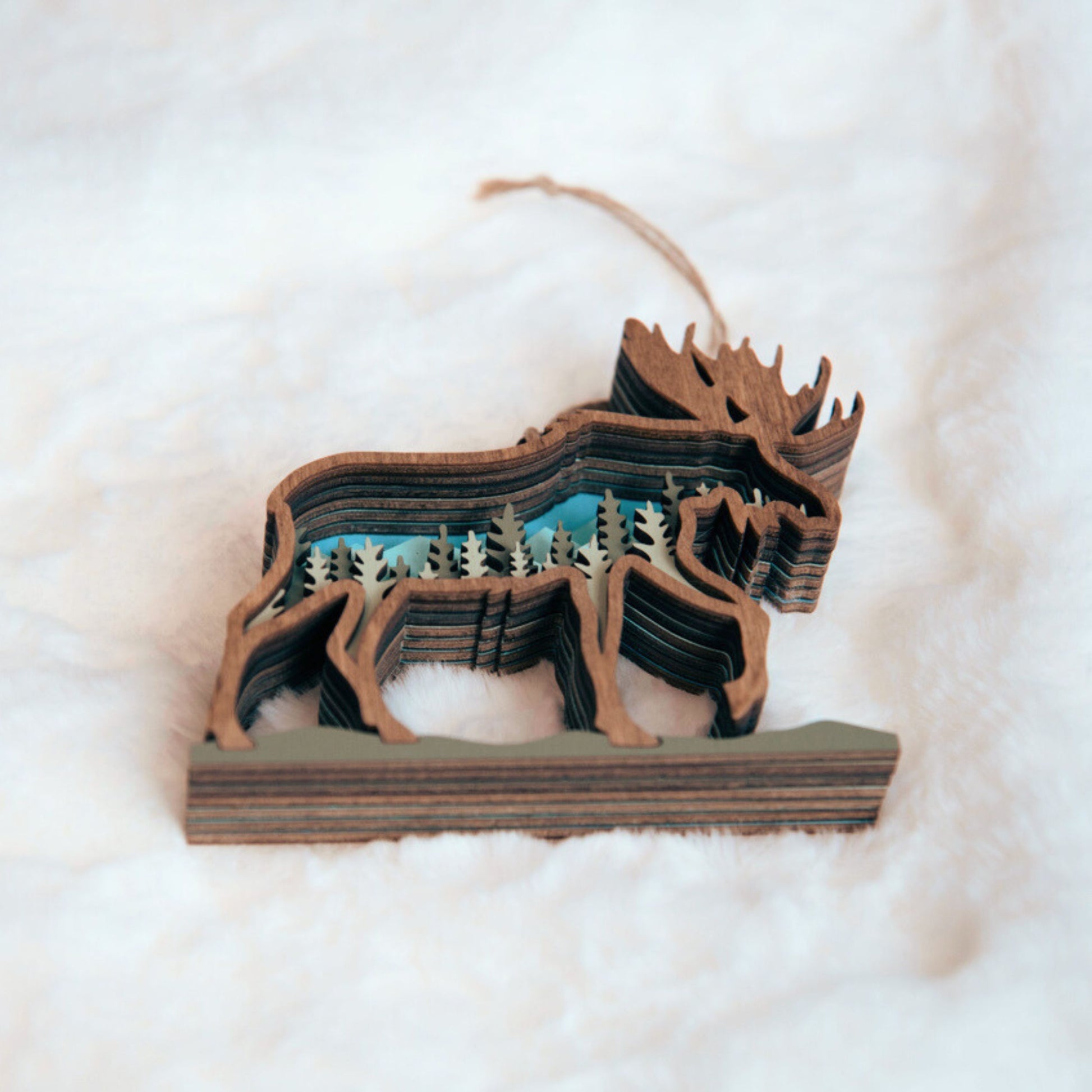 This beautiful wood moose ornament is sure to be treasured for years to come. Crafted with 7 distinct layers painted or stained a different hue to match the beauty of nature. The 3D ornament is inset with detailed mountain and tree layers, perfect for any nature-lover or outdoor enthusiast. The size allows it to stand out on a large tree or add charm to a smaller tabletop one. The hanger is a natural twine to emphasize the woodland feel.
