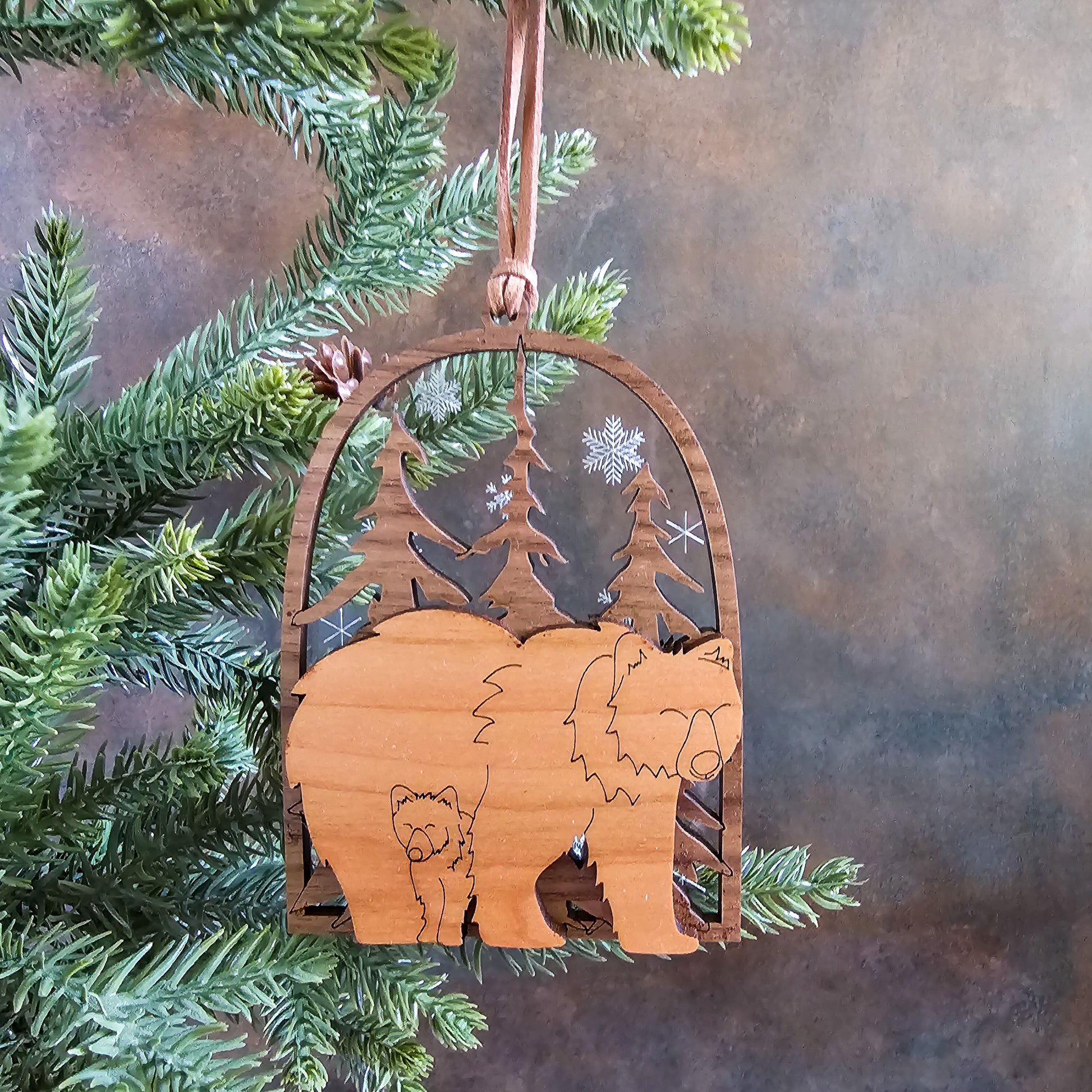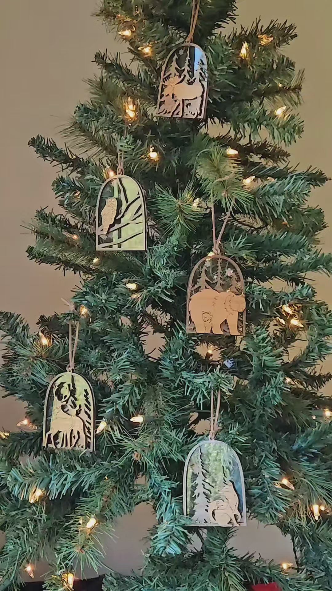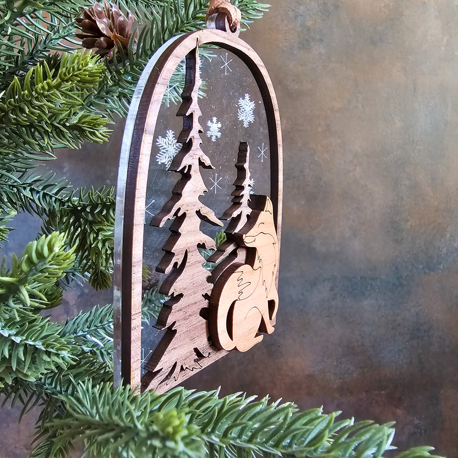 Celebrate the beauty of the wilderness with our arch deer ornament, perfect for adding a rustic, nature-inspired touch to your holiday décor. Handcrafted in our small family studio in Helena, MT, this unique ornament is made from high-quality cherry and walnut wood, combined with an intricately engraved acrylic snowflake background.