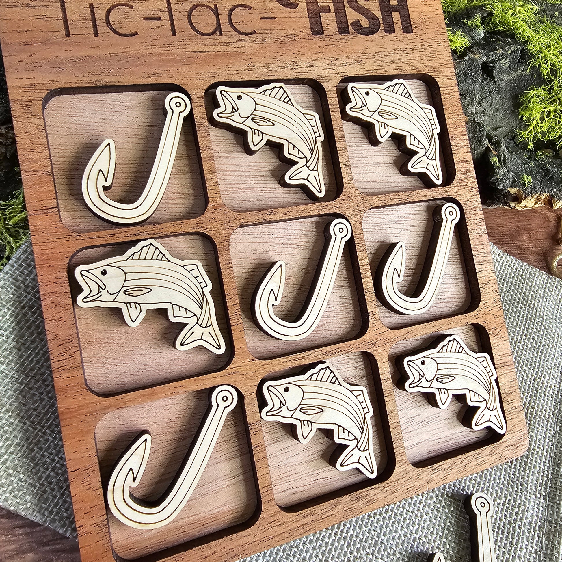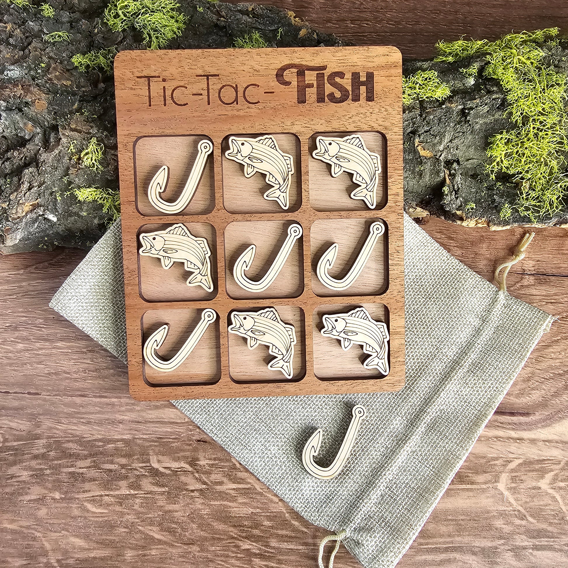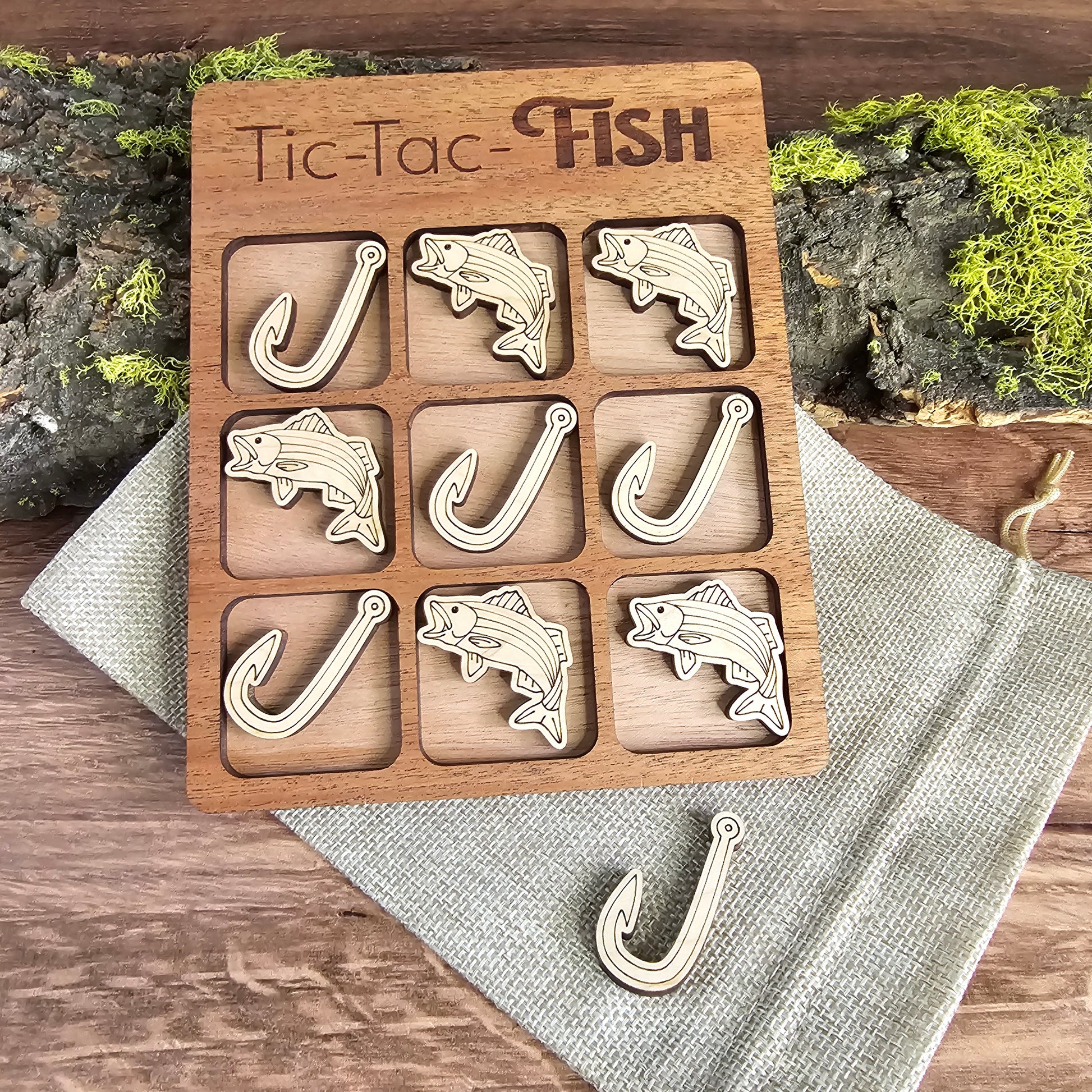 Are you looking for a gift for the fisher? This tic-tac-toe board is a fun piece to play and display your love of fishing. It comes with 5 of each of the fish and hook pieces as well as a burlap bag to contain everything when not playing.