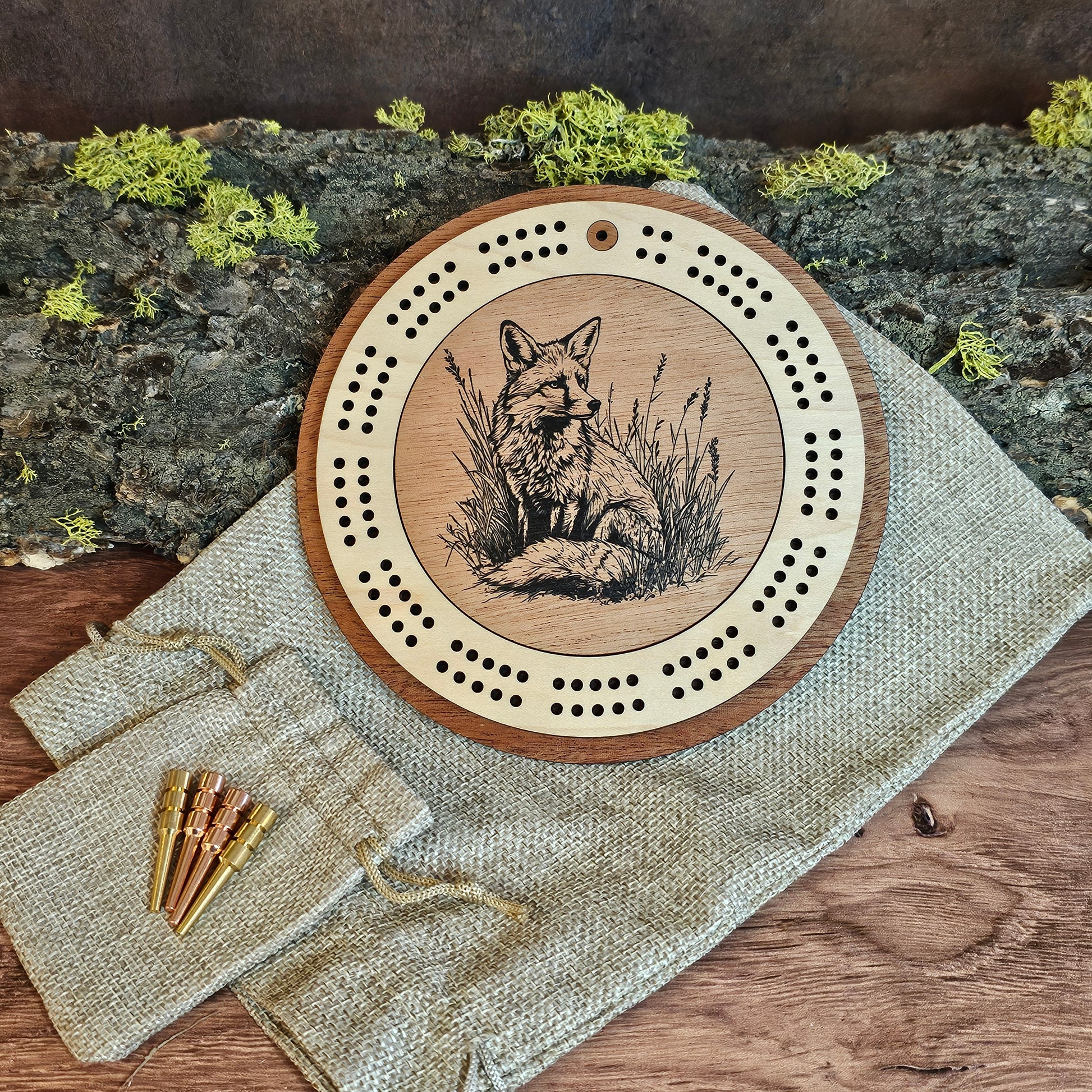 Fox Engraved Mini Circle Travel Cribbage Board