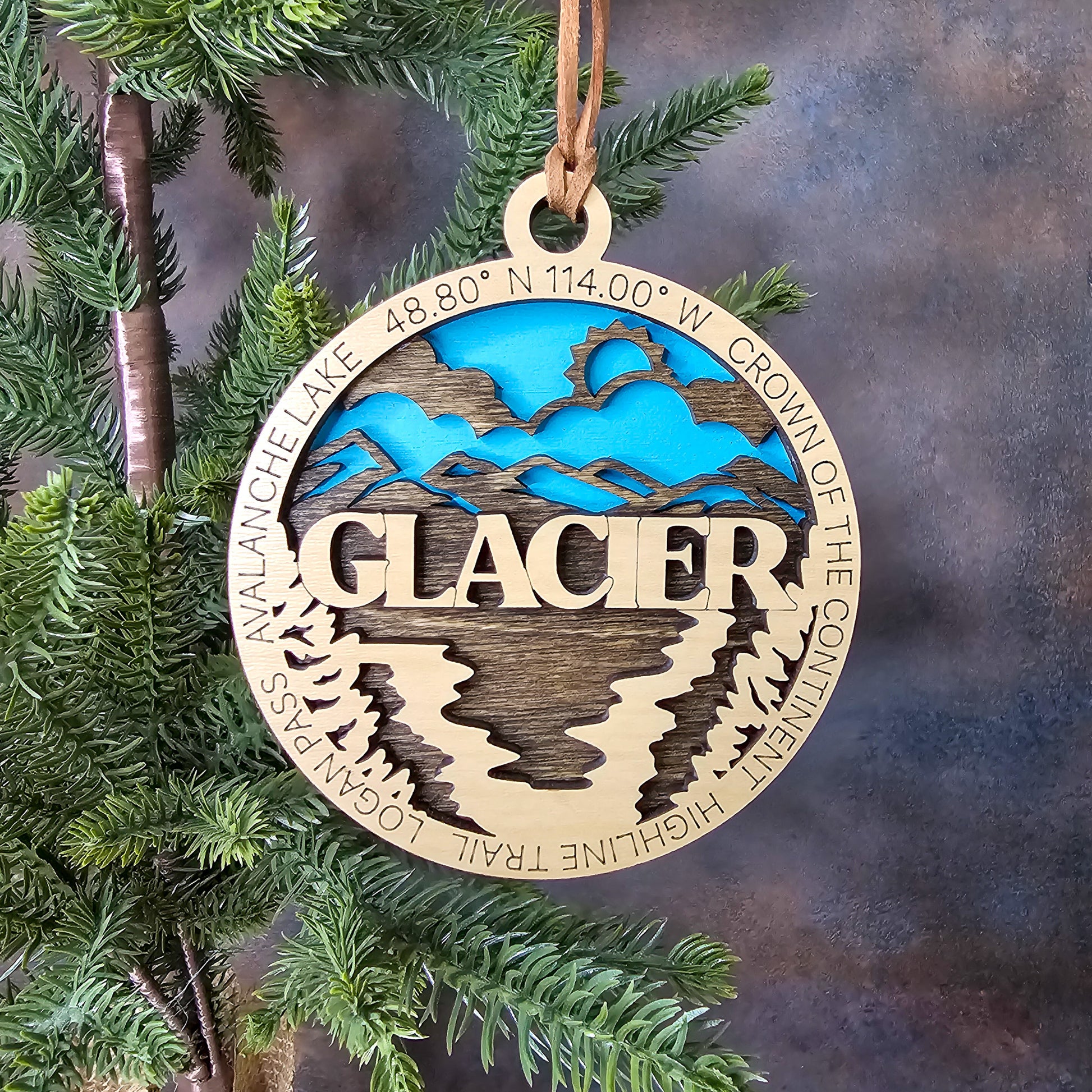 - Material: Made from 3 layers of wood (eco birch, stained birch, & painted birch) with an intricately cut-out illustration of Glacier National Park scenery and hung from a genuine leather loop. The natural wood grain and detailed cut-out design provide a rustic yet elegant appearance. Its durable construction ensures it will remain a cherished keepsake for years to come.
