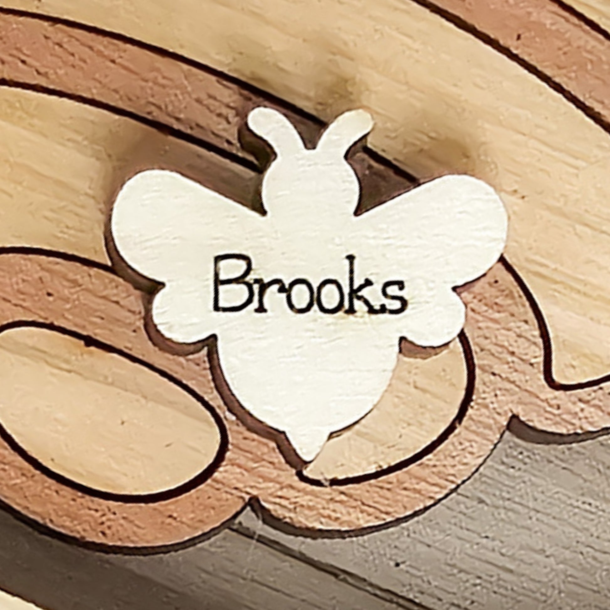 Design: Layered wood sign with a beehive and personalized wooden bees.