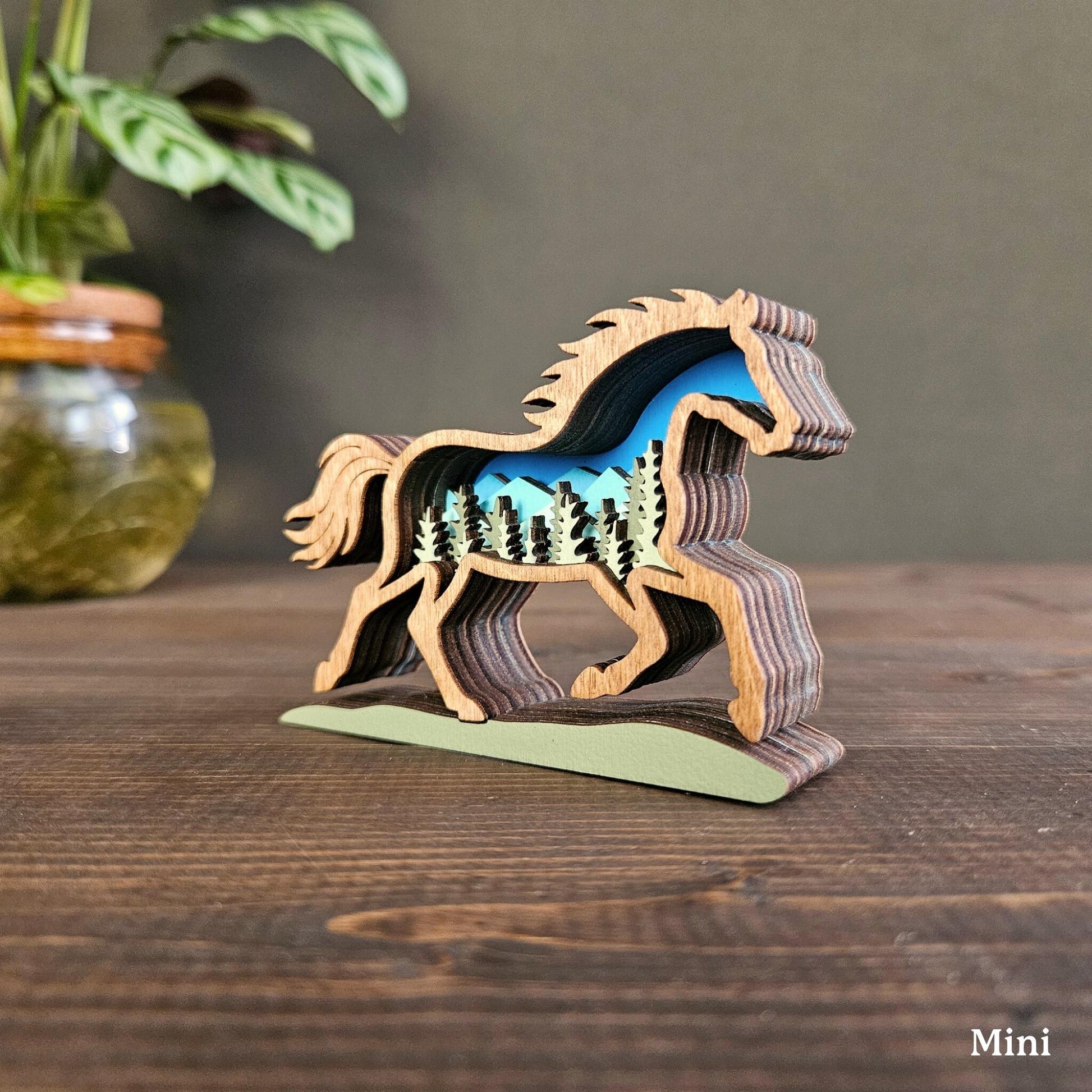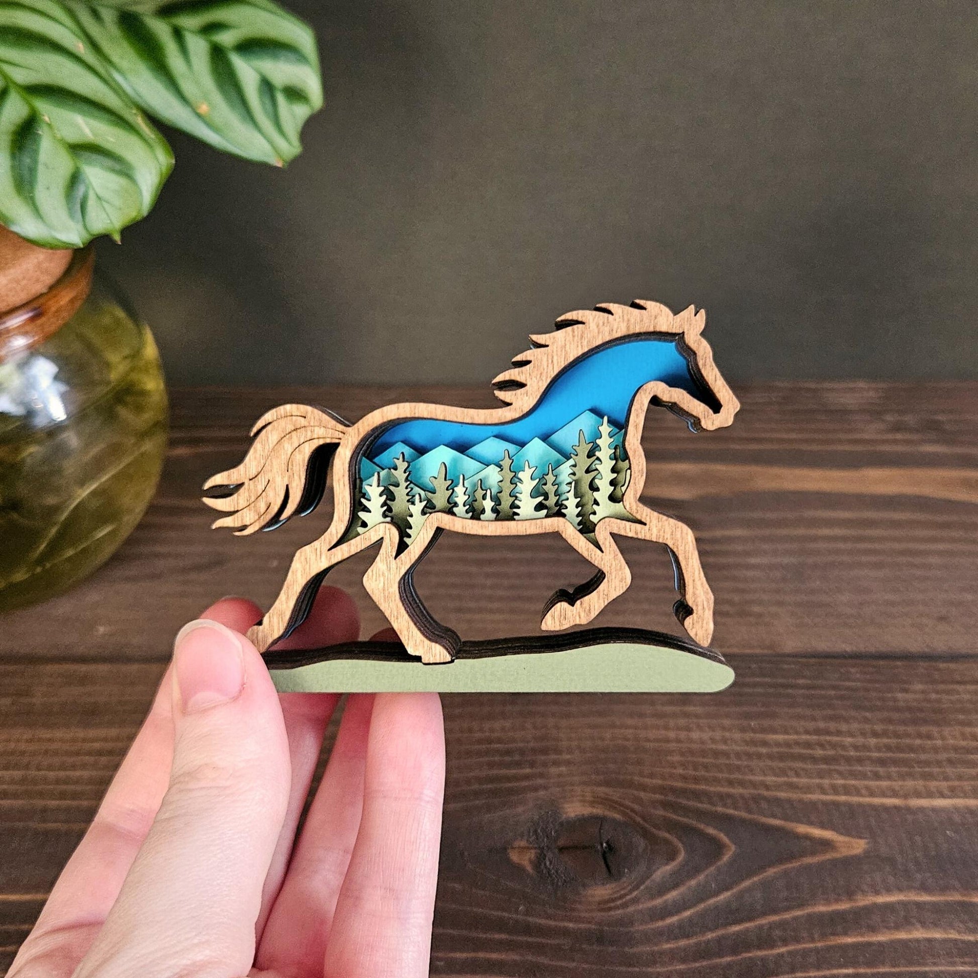 Do you love to excape to the outdoors? This stunning layered wooden wild horse brings the untamed beauty of nature into your home, featuring a detailed mountain and forest scene within the silhouette of a running horse.