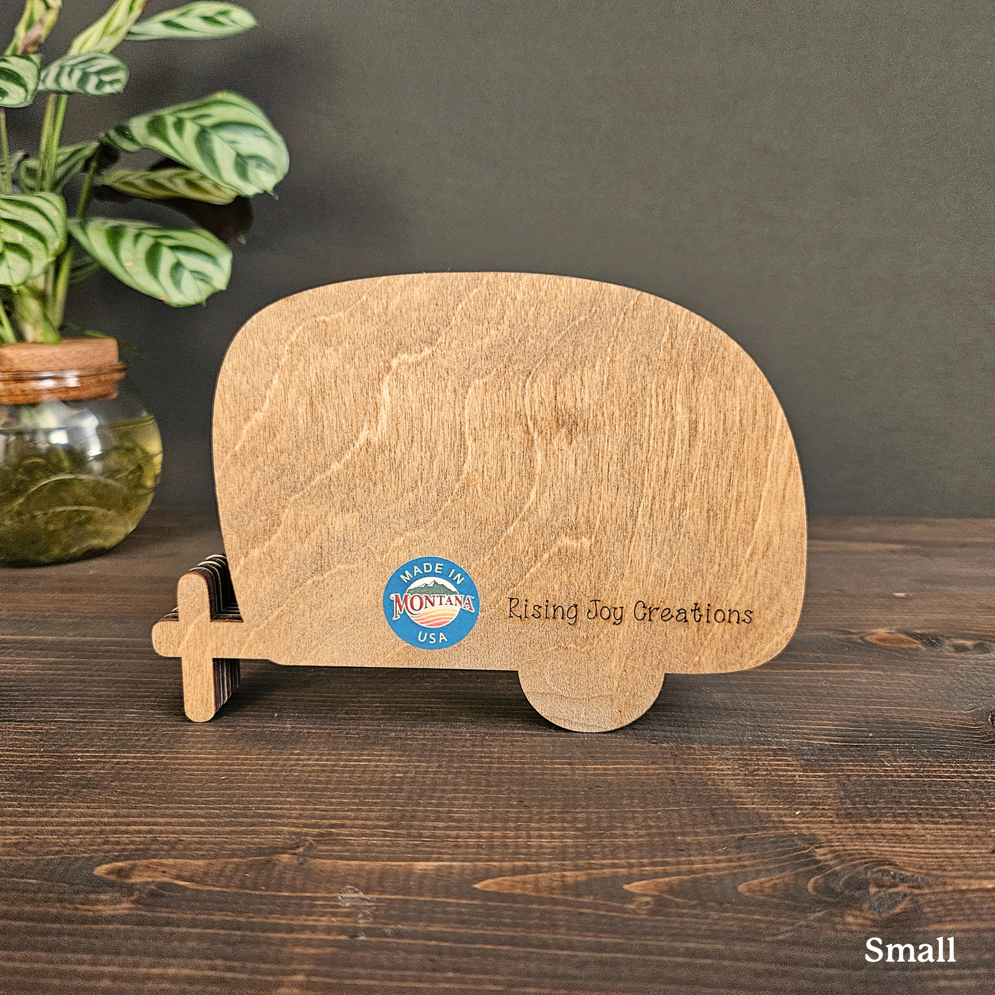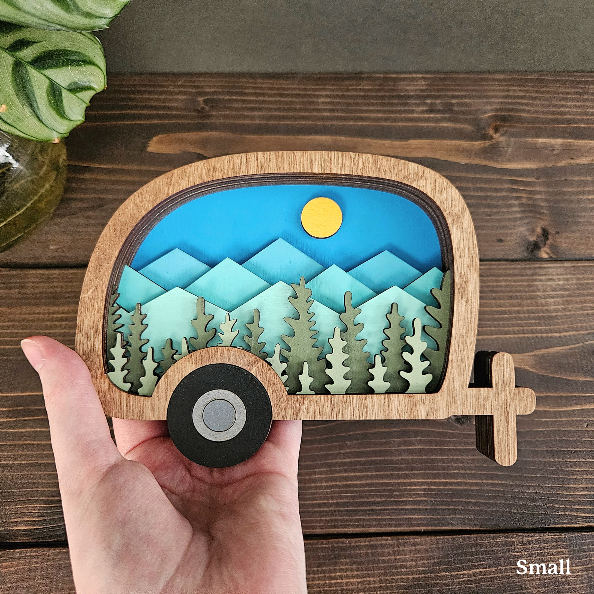 Do you love to escape to the outdoors? This stunning layered wooden retro camper brings the untamed beauty of nature into your home, featuring a detailed mountain and forest scene within the silhouette of a teardrop camper.