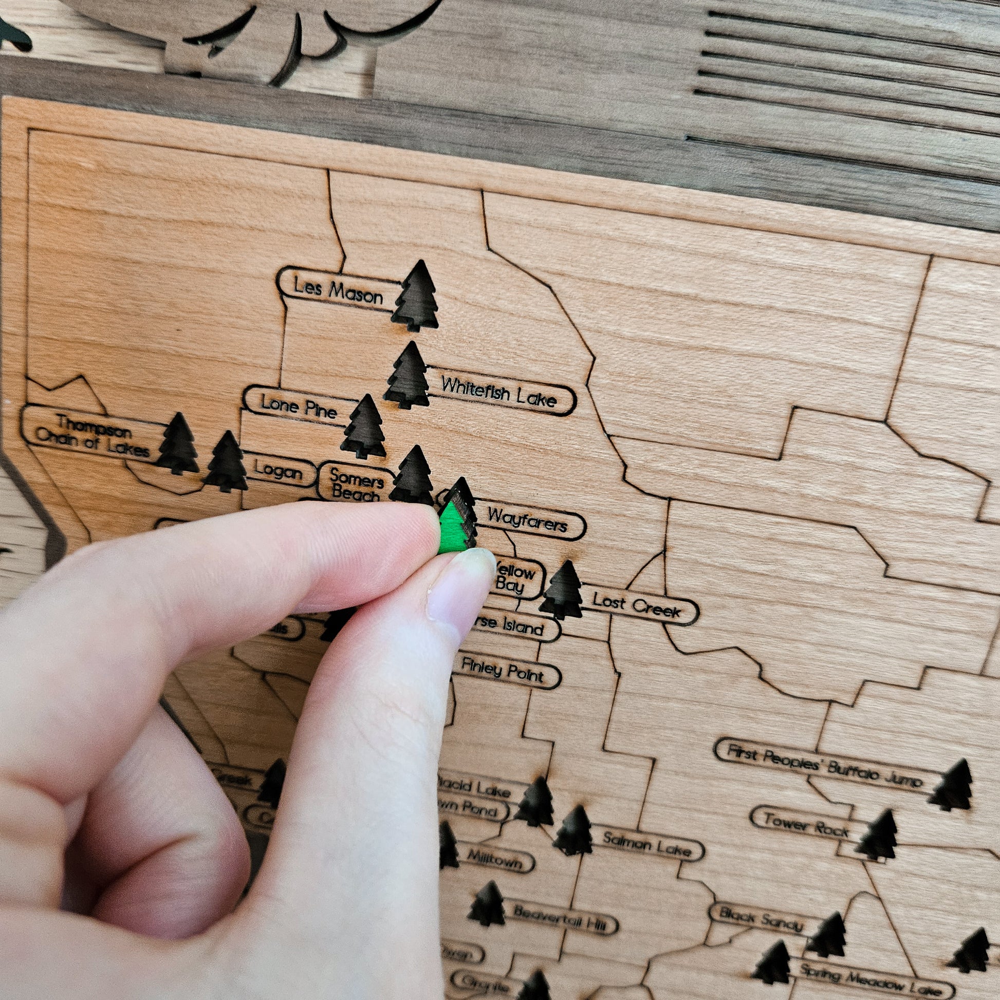 These maps are made of three different layers of wood to create depth and dimension. Each park is listed with a corresponding spot to place the trees as you visit. Each tree has an adhesive tape on the back to make it easy to apply. Simply peel off the backing and insert into the slot. They come in a handy burlap bag for storage. If you prefer not to permanently place the trees you can leave off the tape and they will fit snugly into the outlines.