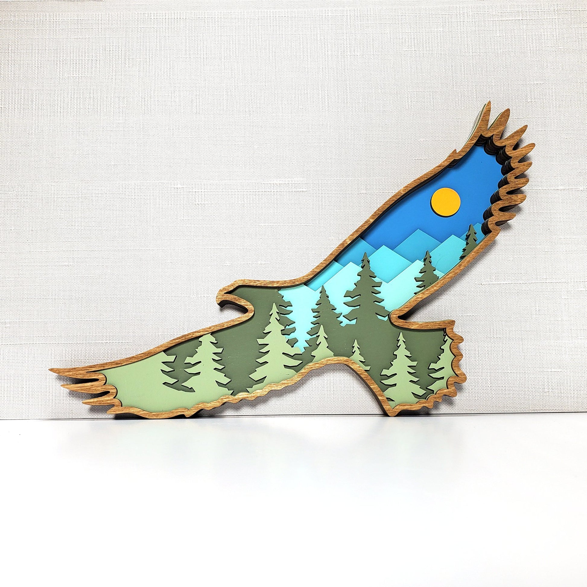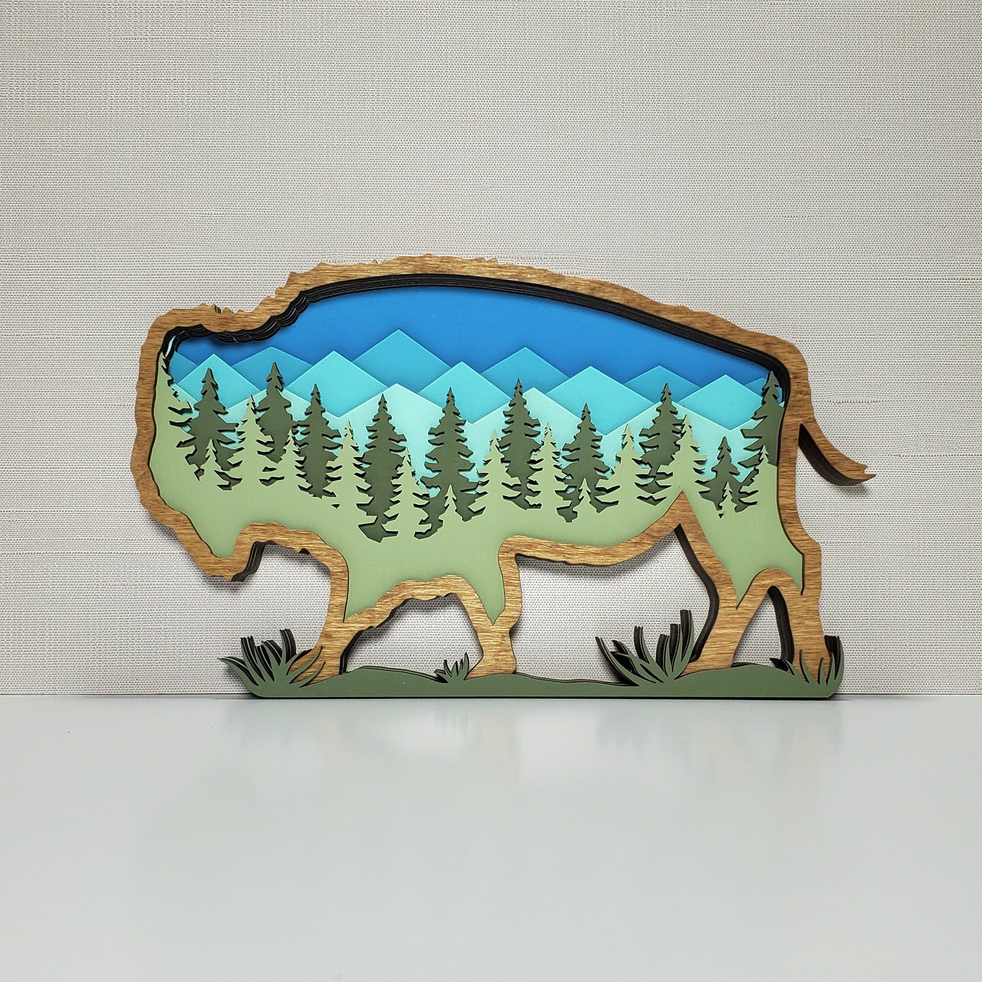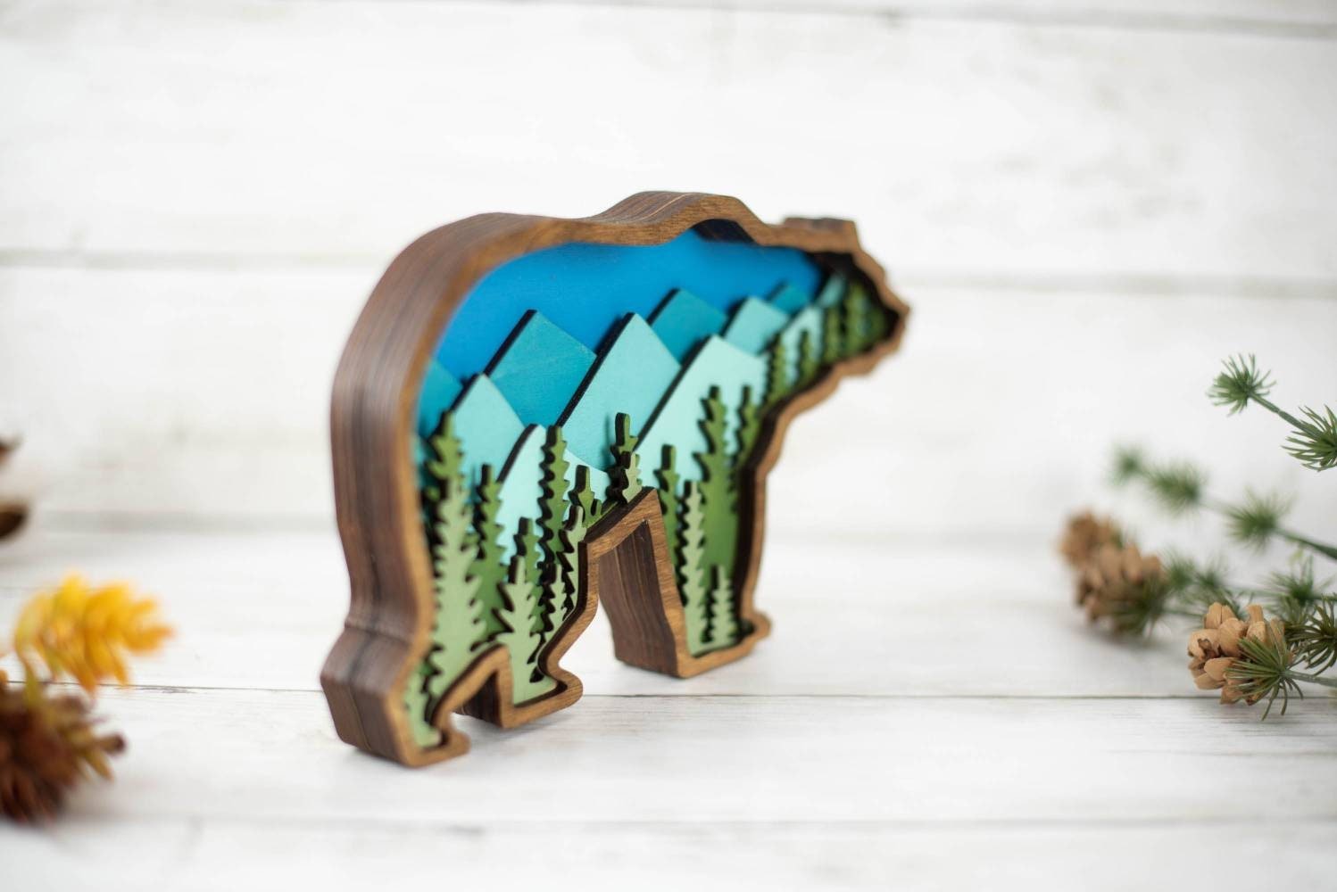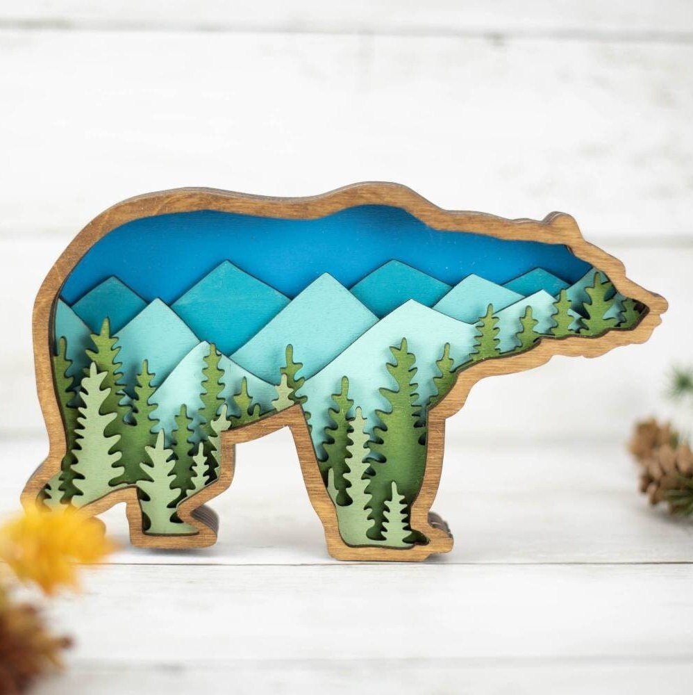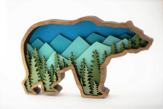 The details in this layered bear art piece are amazing. Whether a woodland, forest or nature themed room, It is perfect for your baby's nursery. Use the small pieces to place on a shelf or dresser. The larger pieces are beautiful hung on a wall or on a shelf. The seven layers are each a distinctive color that blend together in a series of soothing blues and greens. The top layer is stained a rich Early American color. The back is finished in stain as well. The wood piece is laser cut and has six different sizes available (rounded to the nearest quarter inch): Large: 10" x 17" Medium: 6" x 10"; Small: 4" x 6.75" We believe you are best able to decide the need for hanging hardware based on the use of your item it is not included with the piece. Although there are several layers in each piece they are very light weight and often customers use repositionable command strips to hang their items. If attaching hanging hardware, we recommend you attach through the outer border where there are several layers of thickness. This item is also available as a precut kit so you can have the fun of painting and add your personal touch.