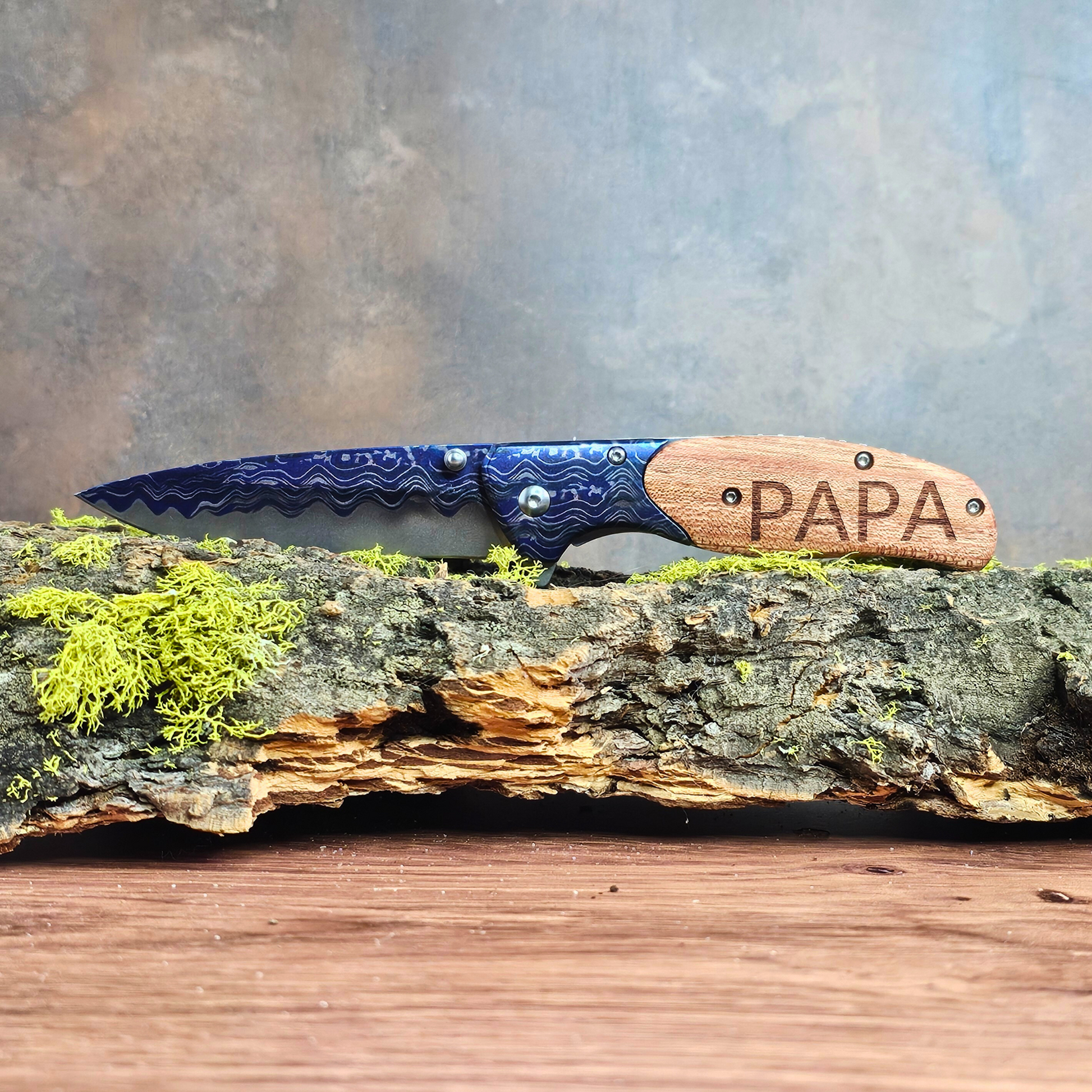 Crafted in our family-run studio in Helena, MT, this Personalized Blue Wave Knife combines practicality with a personalized touch. Ideal for camping, hiking, or gifting, it’s made for those who value a unique personalized gift or keepsake.