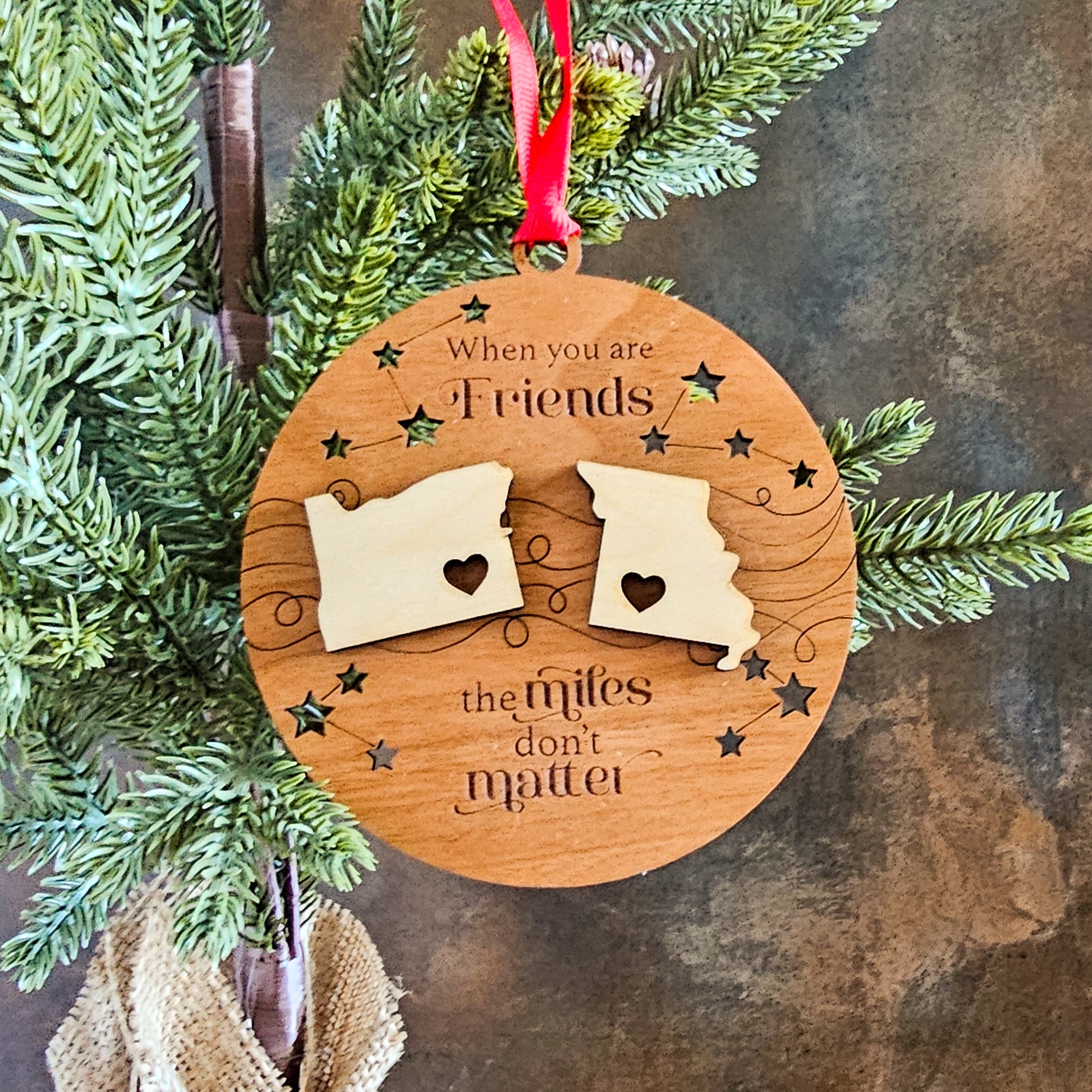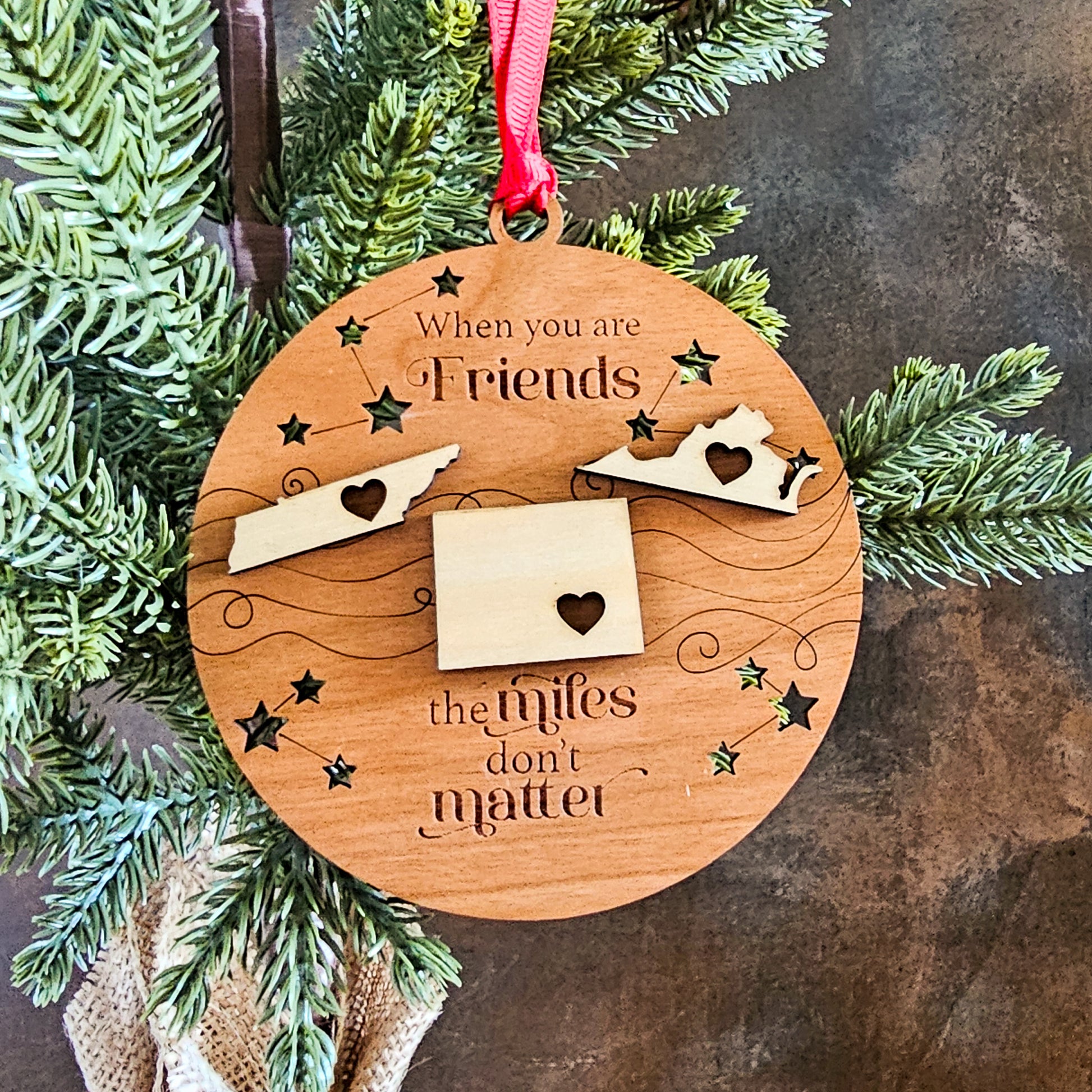 Celebrate the friendships that mean the most with our handcrafted ornament, featuring the touching quote, "When you are friends, the miles don't matter." This special keepsake allows you to customize it with up to three state silhouettes, representing the homes of your closest friends. Whether near or far, this ornament is a heartfelt reminder of the bonds that stand the test of time and distance.