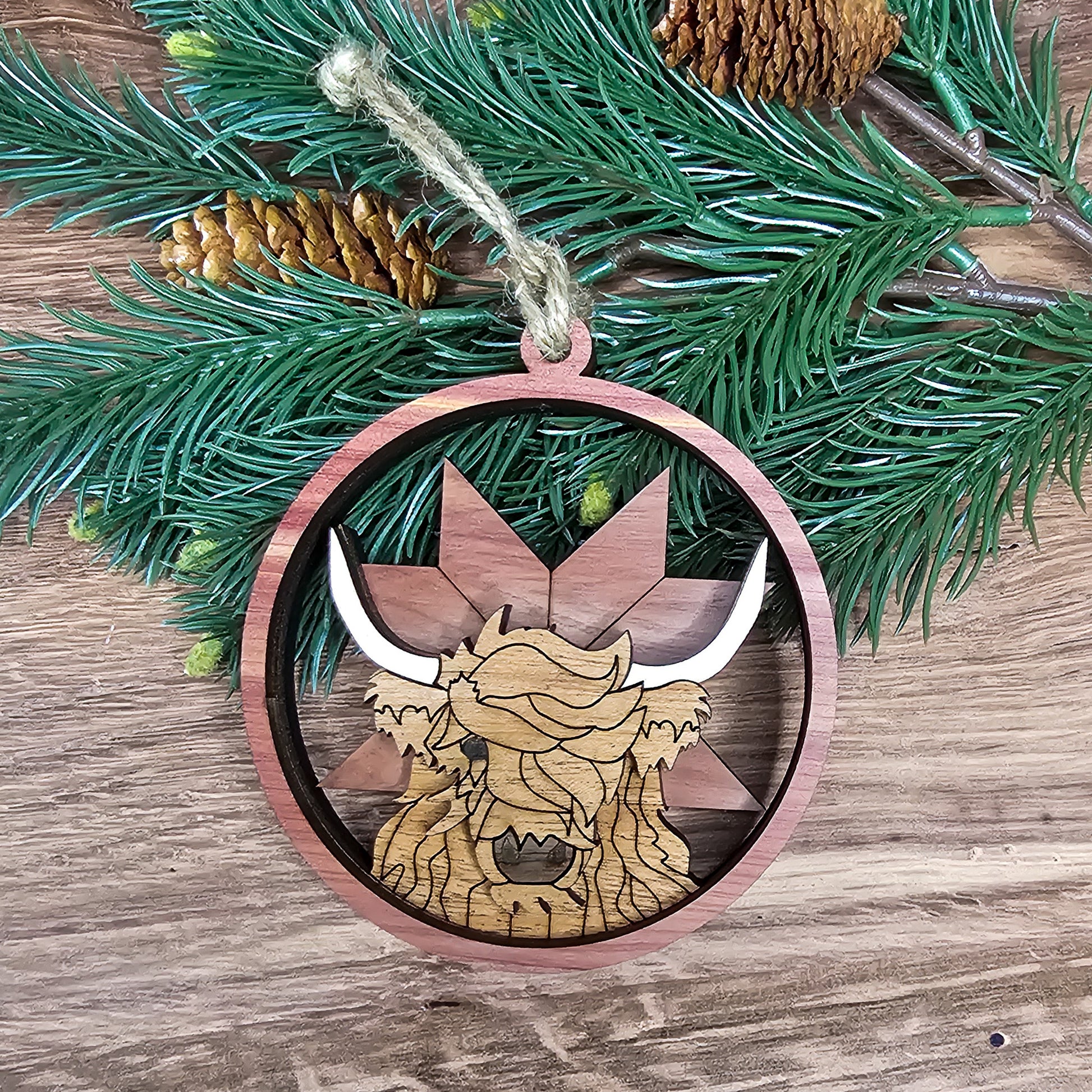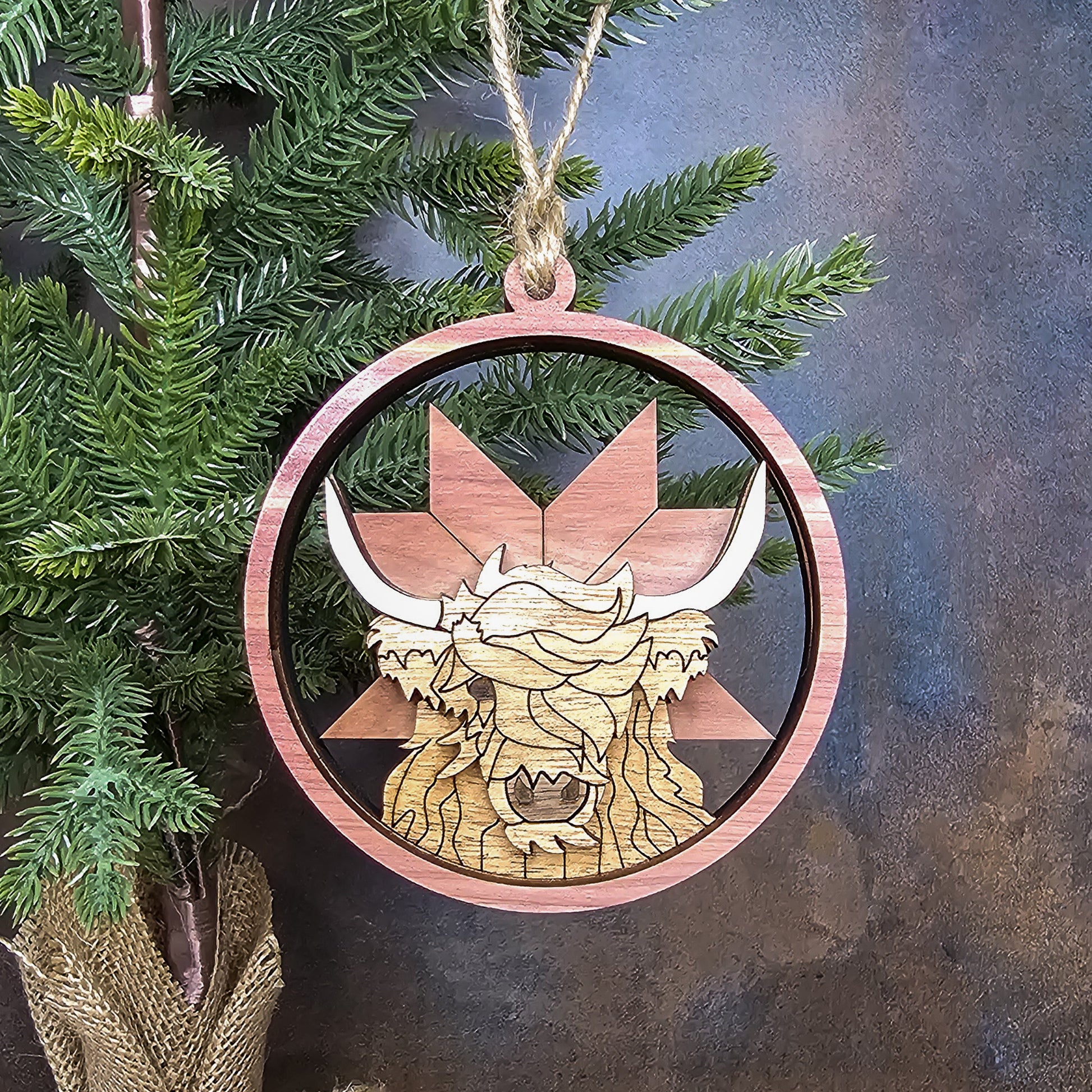 Handcrafted Wood Quilt Highland Cow Ornament – A Symbol of Strength, Warmth, and Rustic Beauty